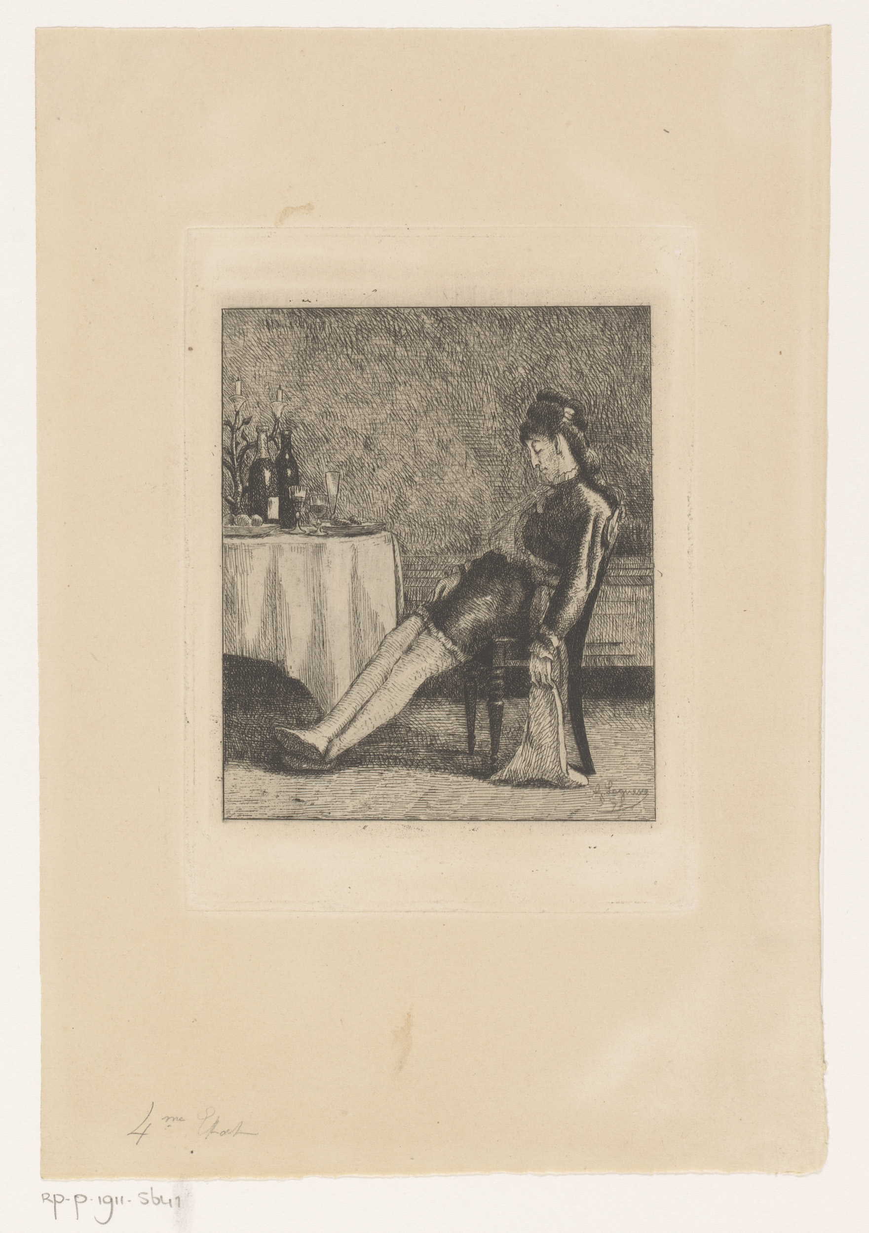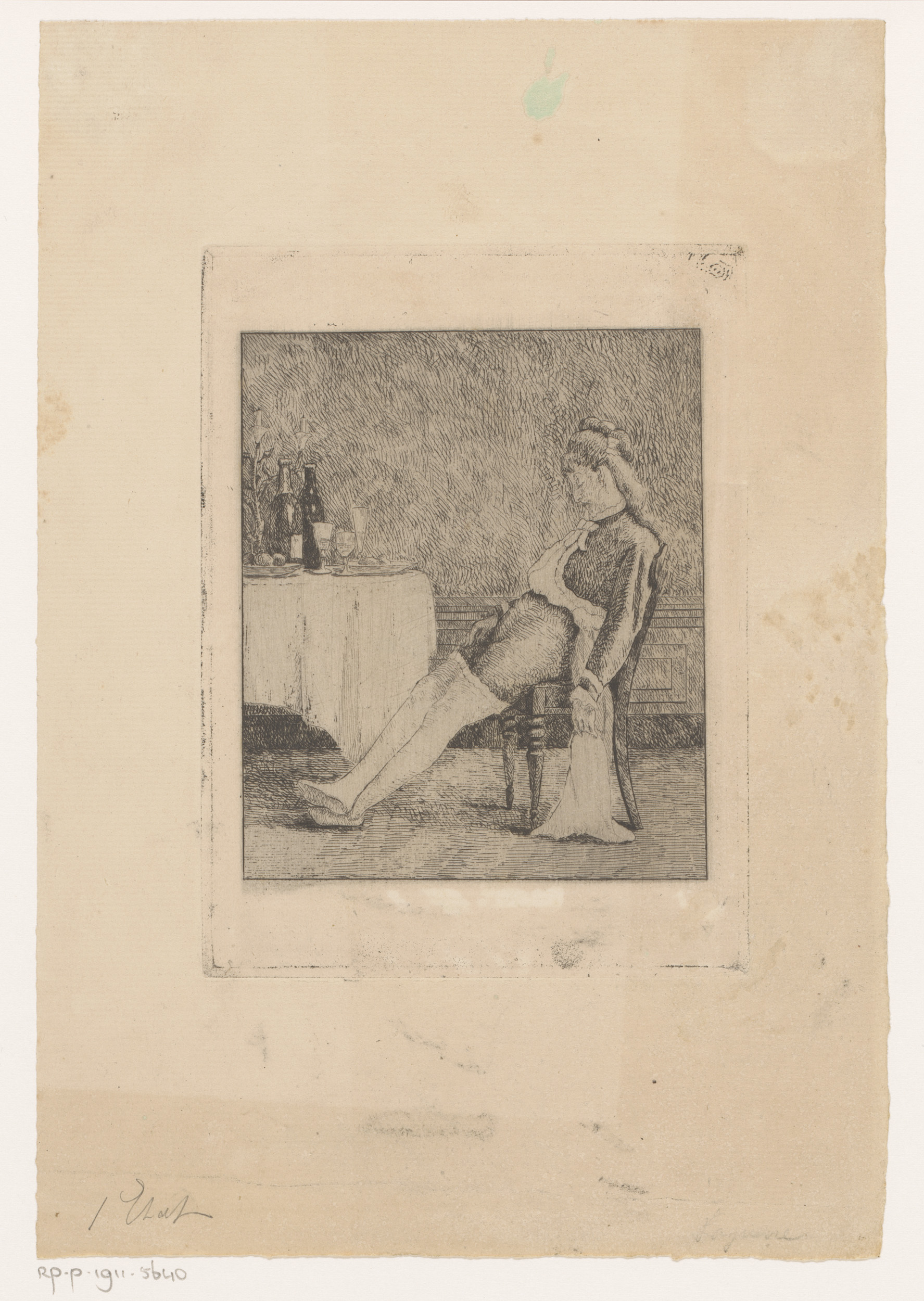 Jonge vrouw onderuitgezakt in een stoel aan een tafe...