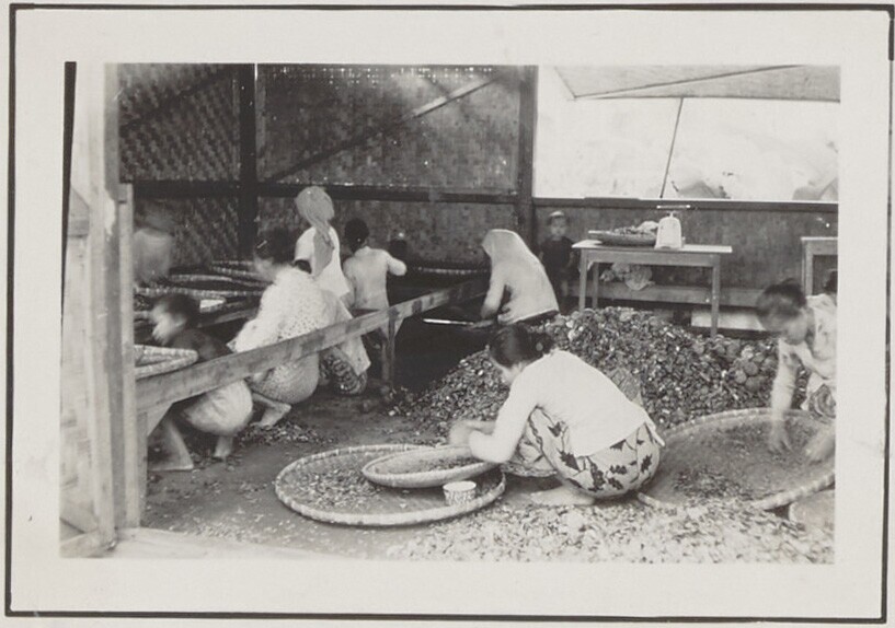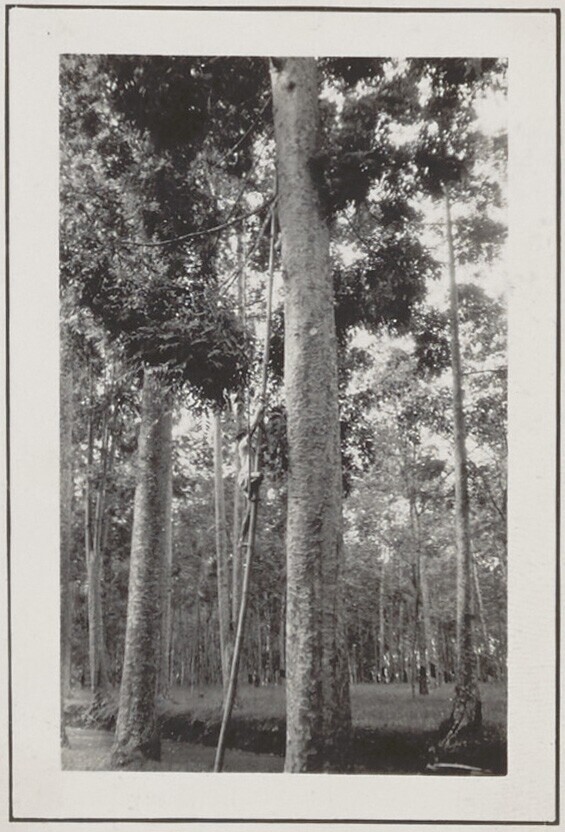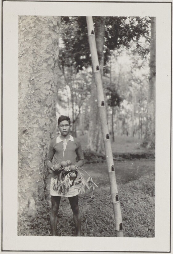 Vrouw met de geplukte vruchten van een damarboom (Ag...