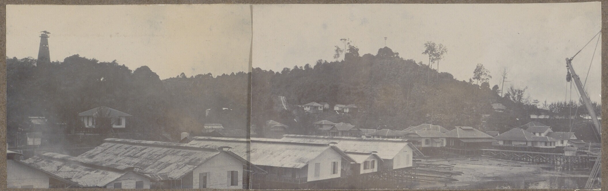 Zicht op haven van Balikpapan met loodsen en gebouwe...