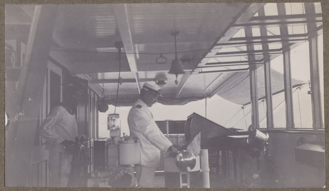 Kapitein Hobma en tweede stuurman in de stuurhut van...