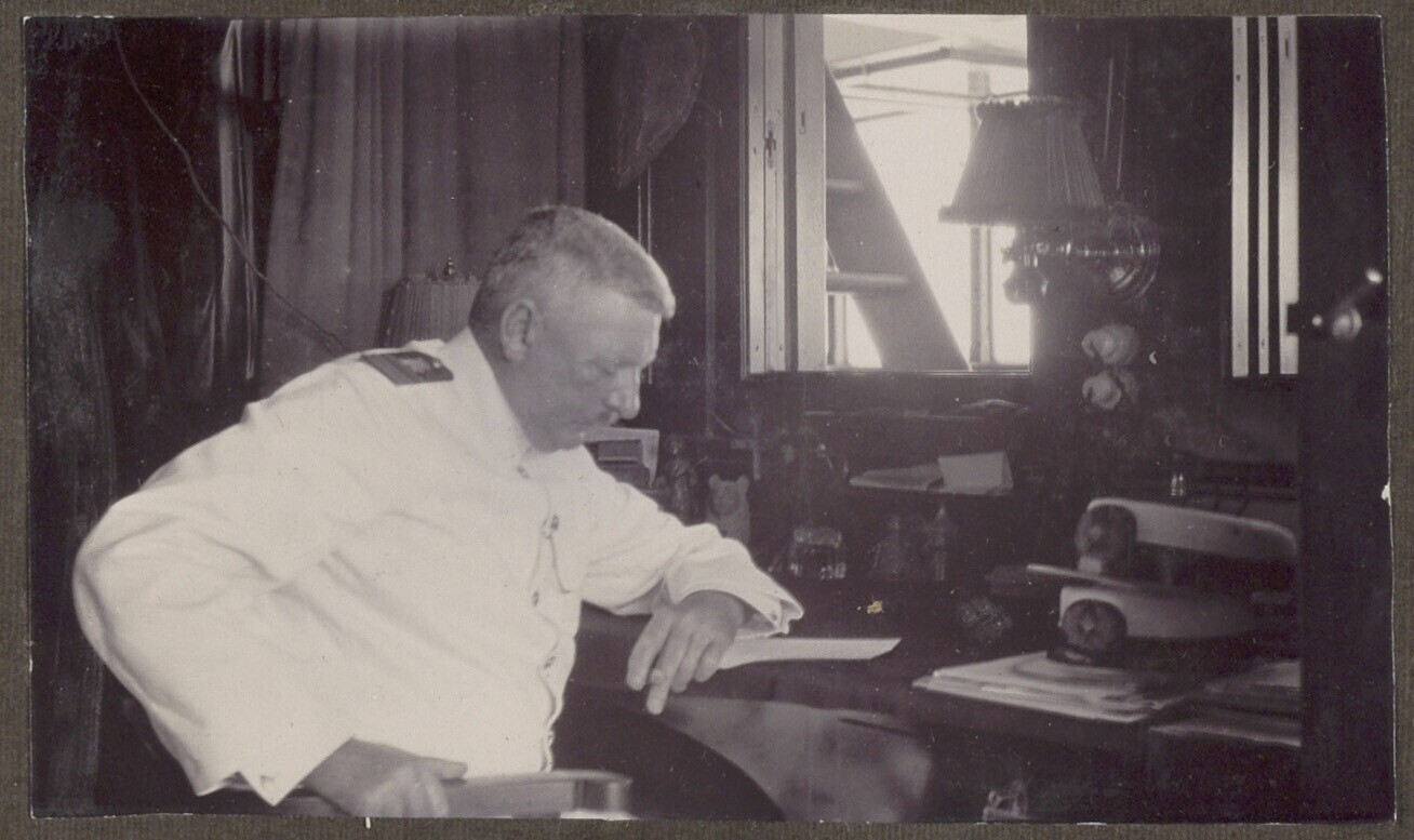 Kapitein Albert Hobma aan een bureau aan boord van s...