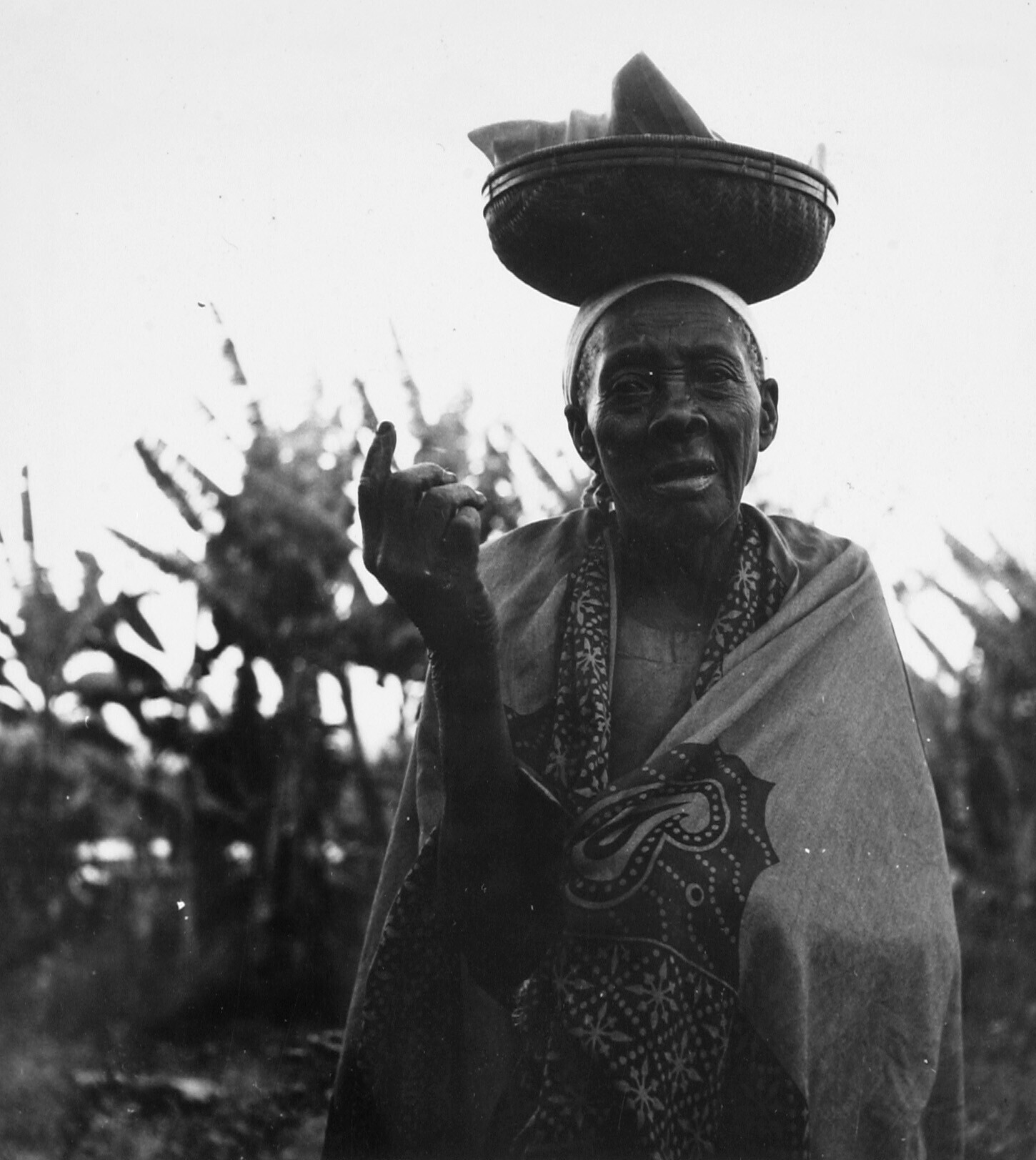 Portret van een oudere Nyakyusa vrouw met een mand o...