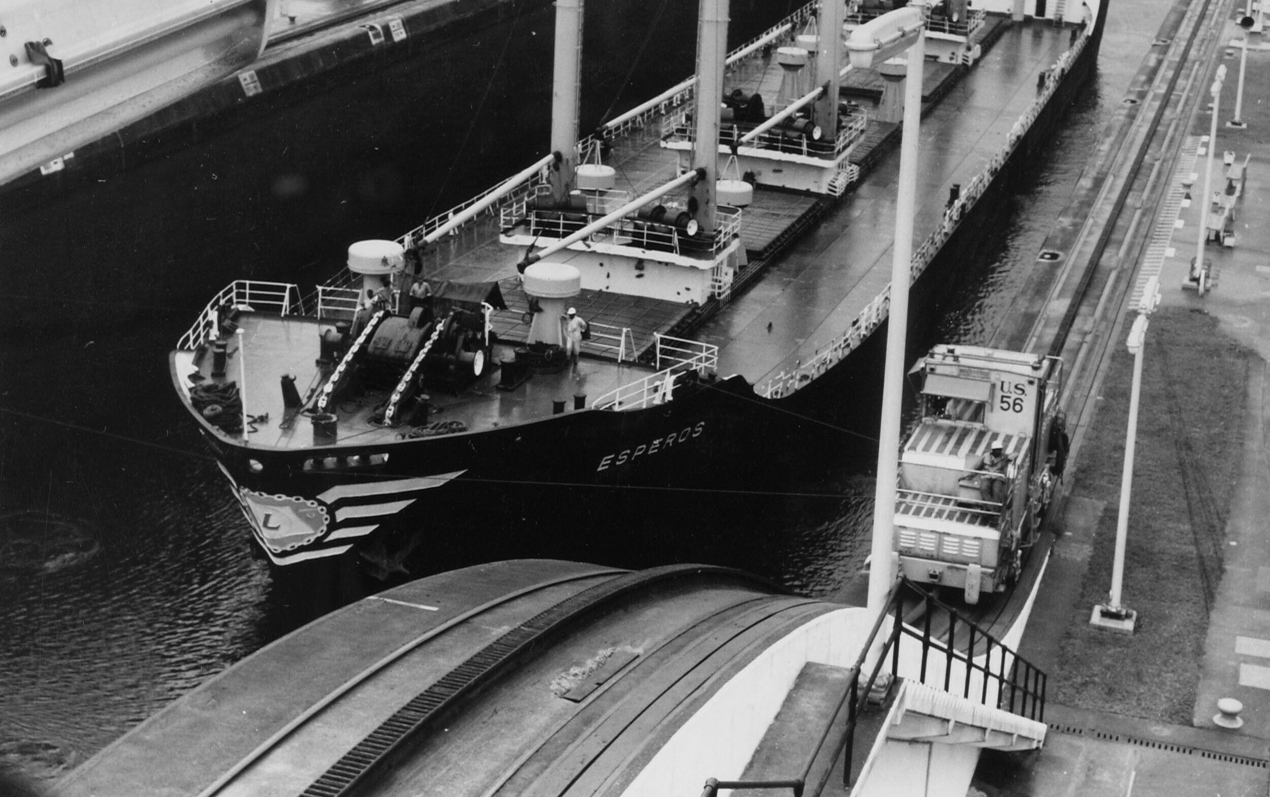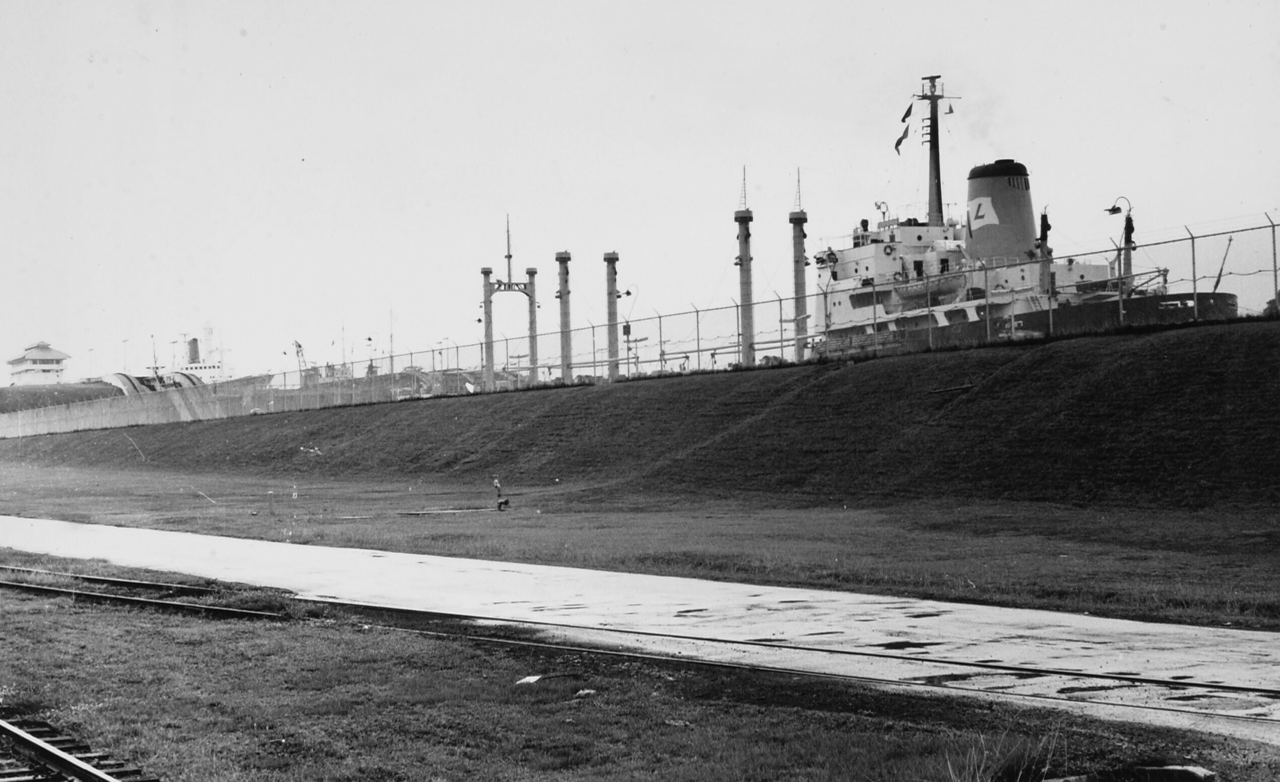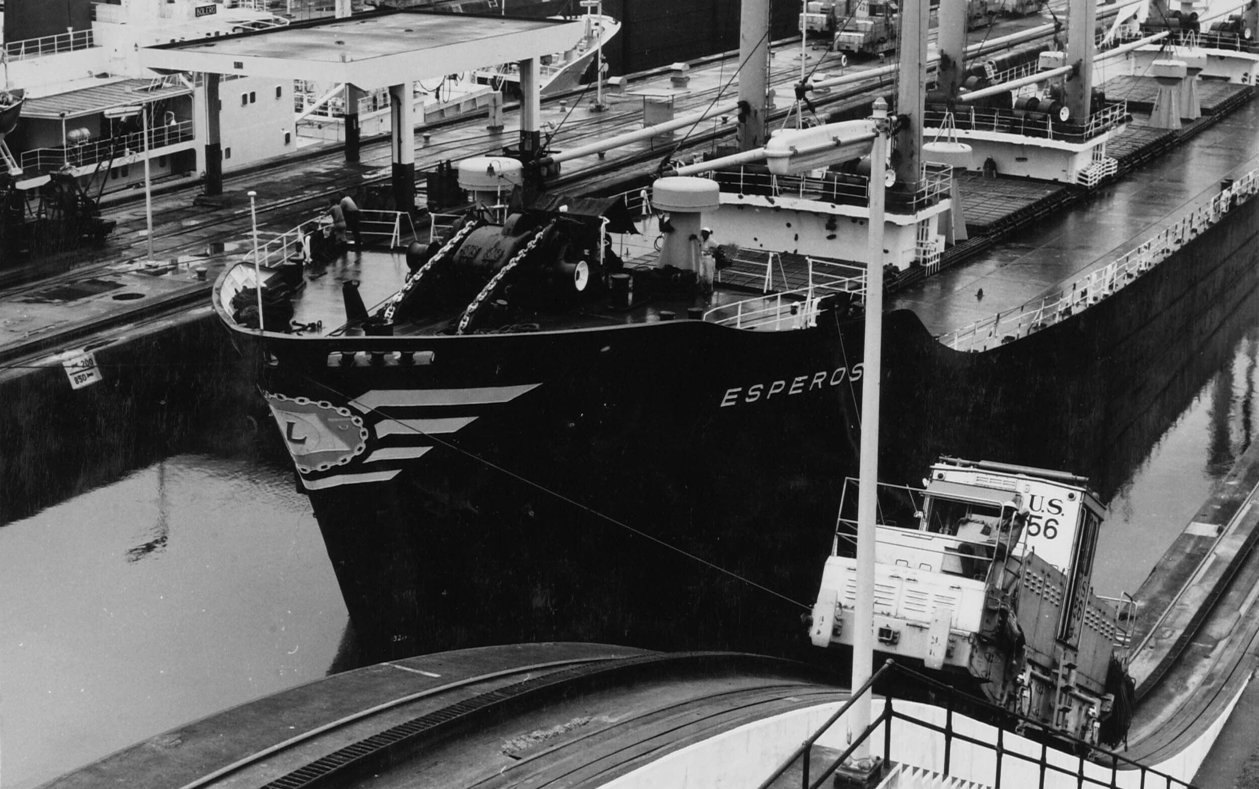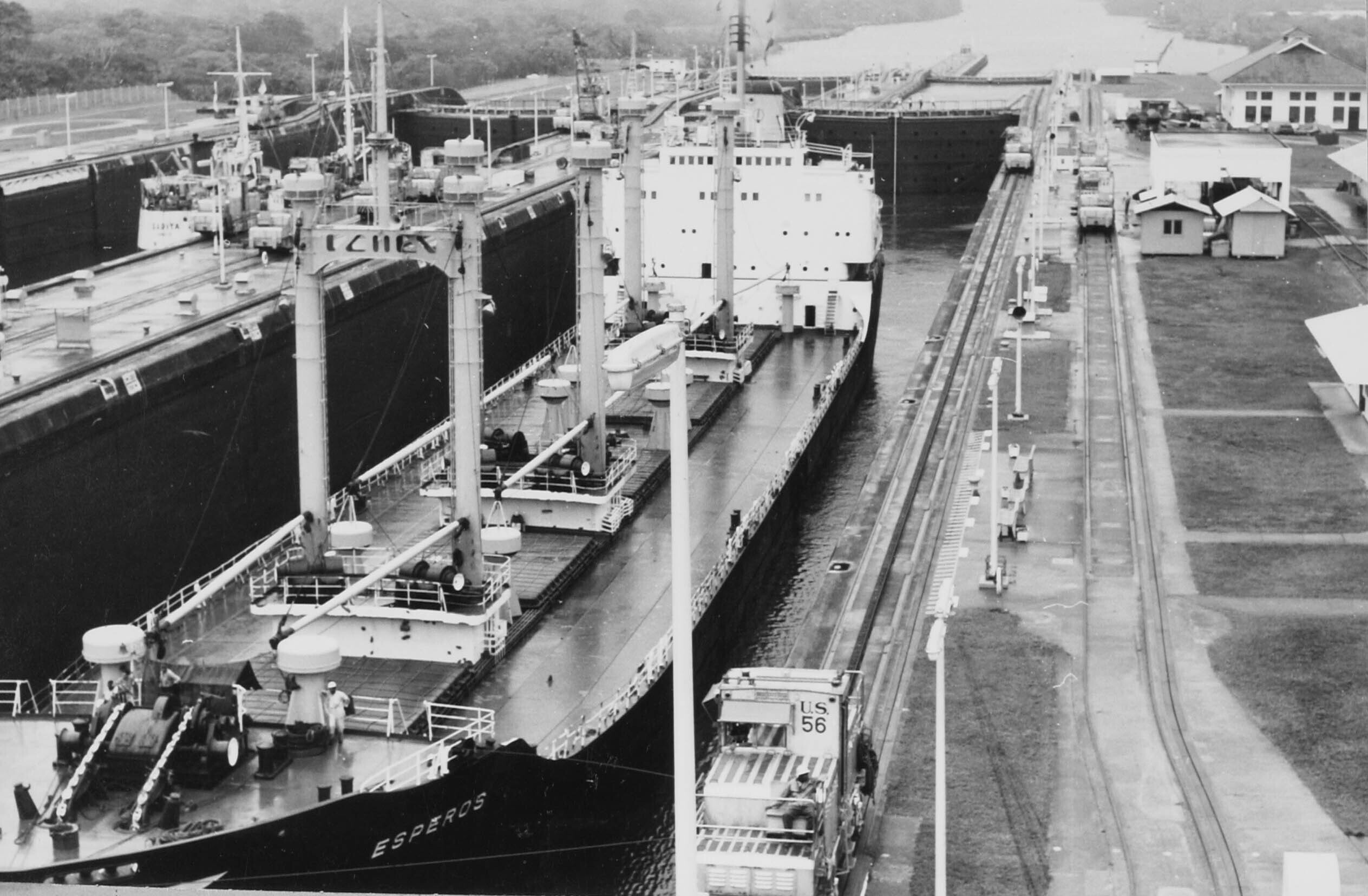 Panama kanaal. Schip wordt door sluis getrokken naar...