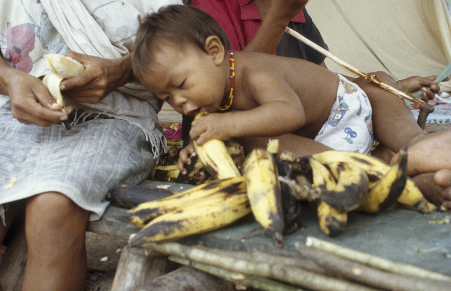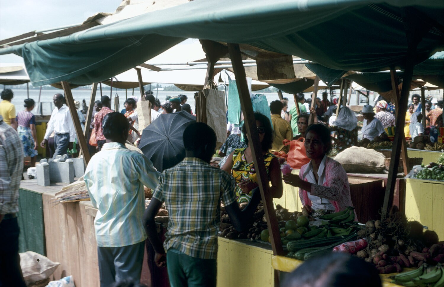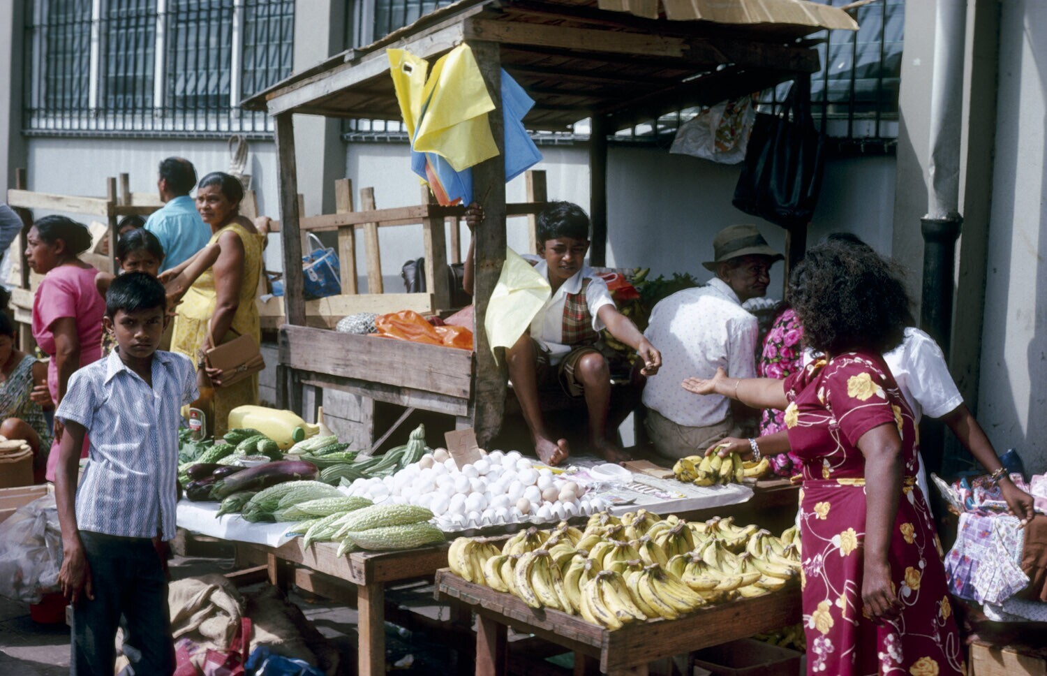 Markt buiten de markthallen te Paramaribo, kind met ...