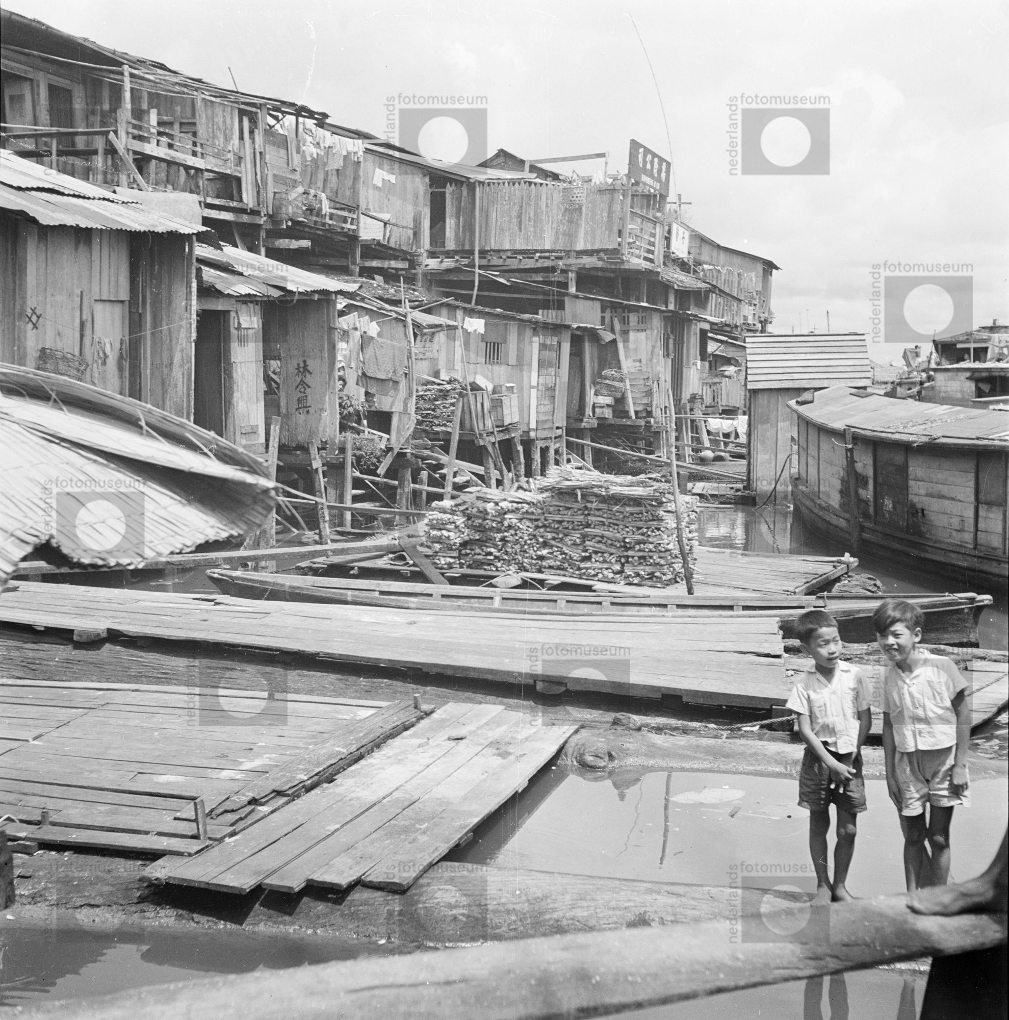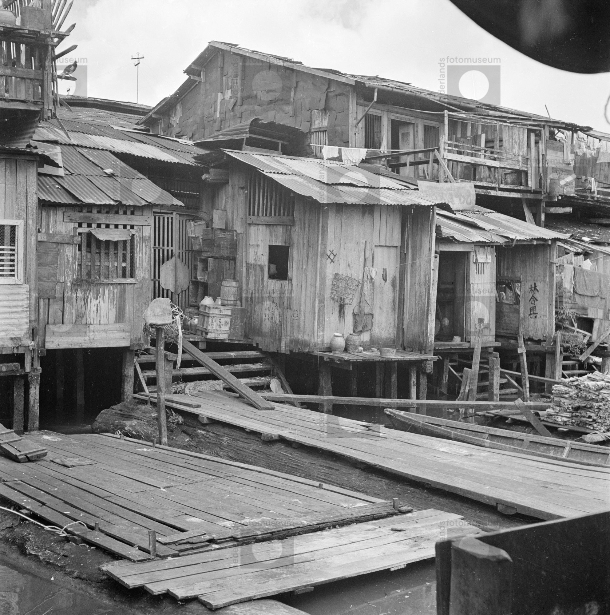 Paalwoningen met aanlegsteigers langs een rivier, In...