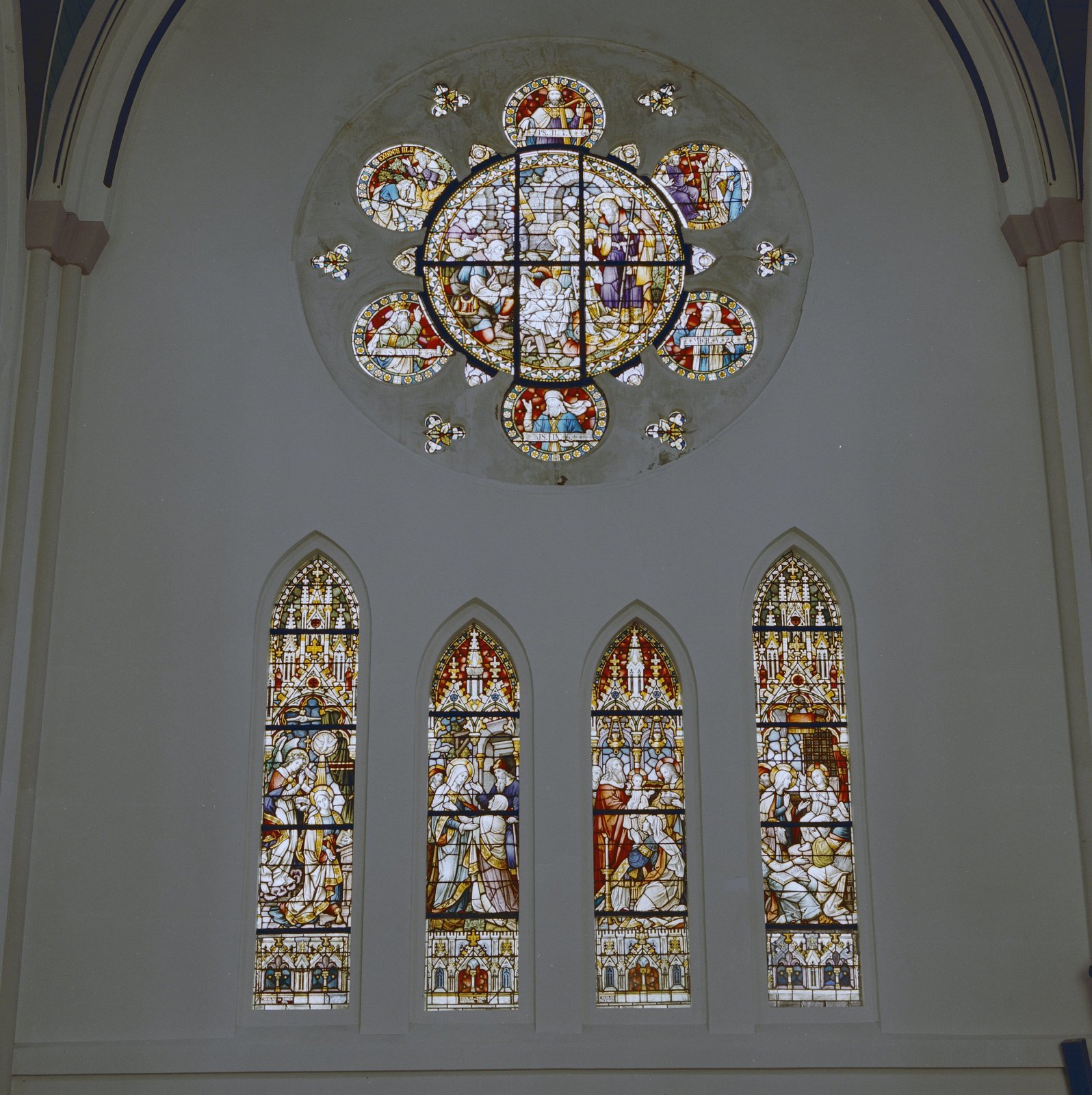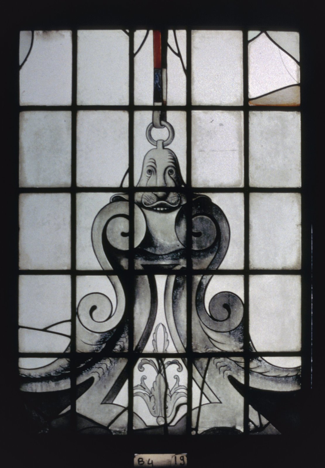 Interieur, gebrandschilderd glas, raam 19: "Wapen va...