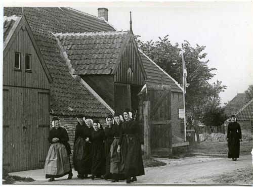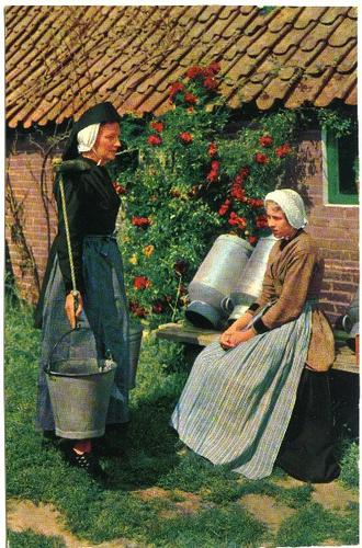 Prentbriefkaart in zwart-wit van vrouwen in klederdr...