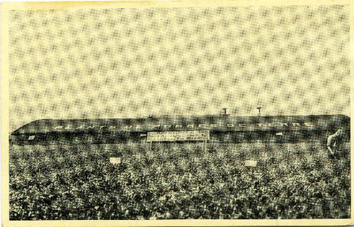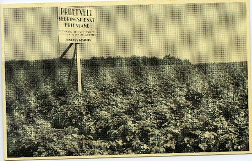 Prentbriefkaart in zwart-wit van een proefveld aarda...