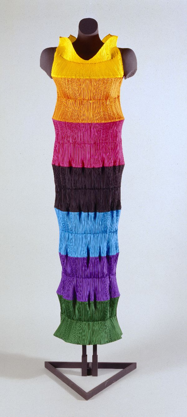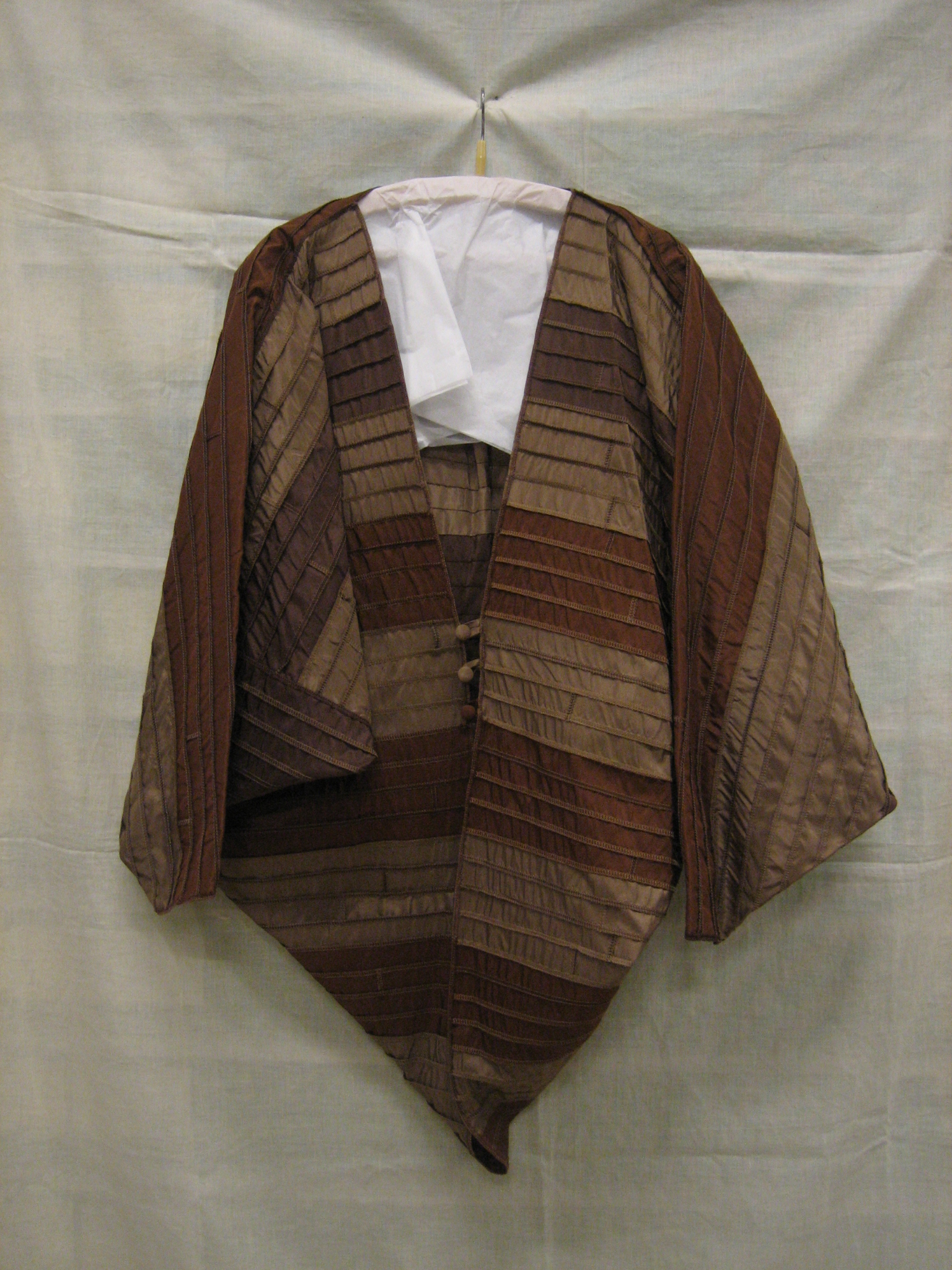 Poncho van aaneengestikte repen zijde in drie kleure...