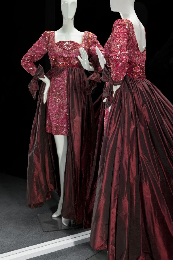 Avondjurk, minijurk van rode taftzijde, lijfje en mo...