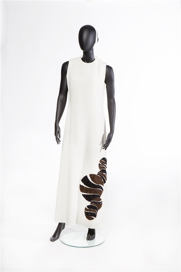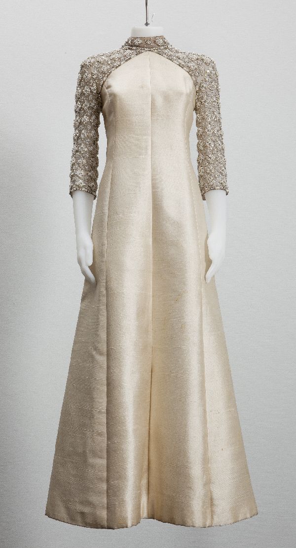 Mouwloze crèmekleurig avondjurk in driebaans hemdmod...