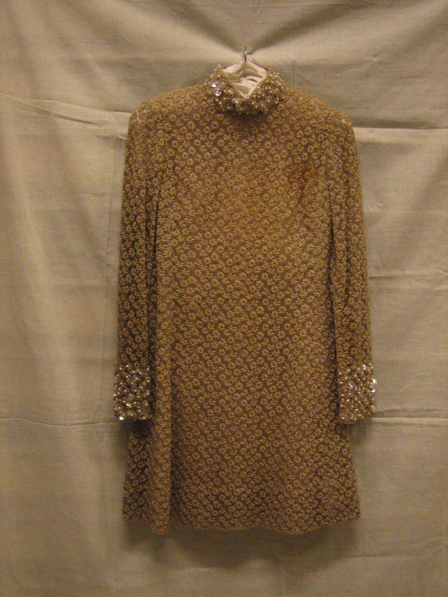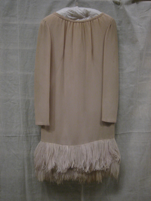 Cocktailjurk van beige wollen crêpe met aan onderzij...