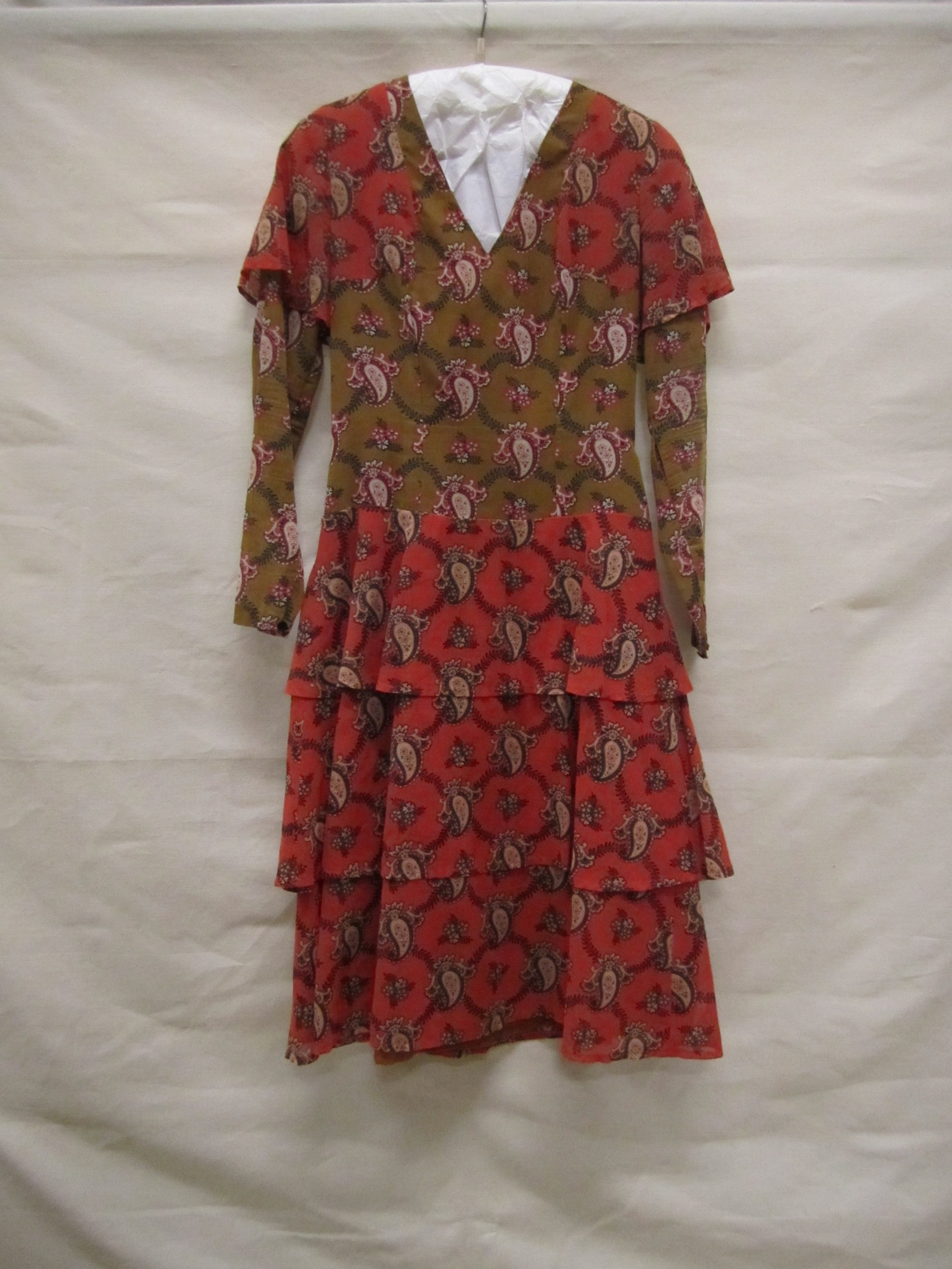 Jurk van rode en geelbruine mousseline katoen, bedru...