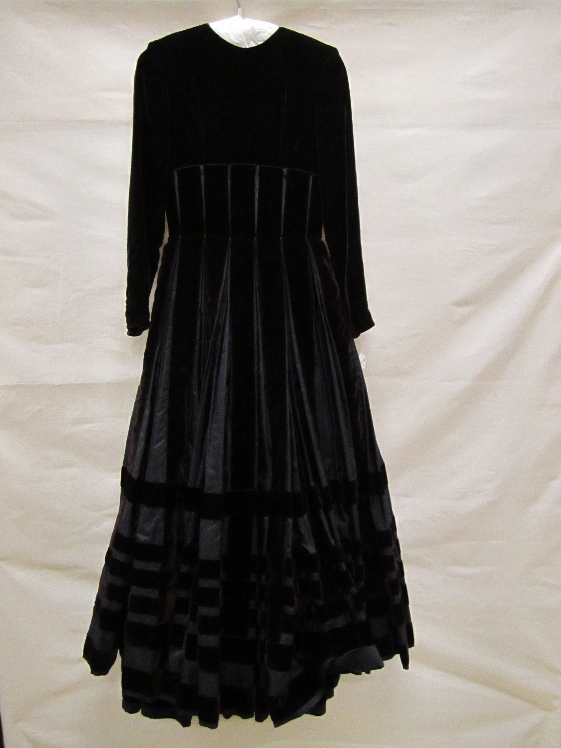Avondjurk van zwart fluweel met verticale tussenbane...