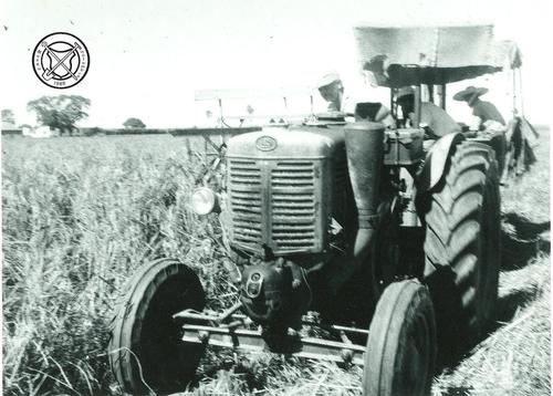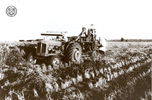 Tractor en zeis tijdens rijstoogst