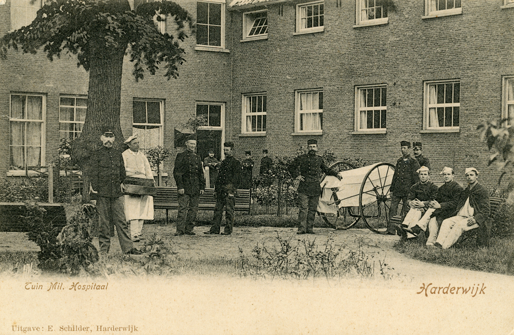 Prentbriefkaart, getiteld 'Tuin Mil. Hospitaal Harde...