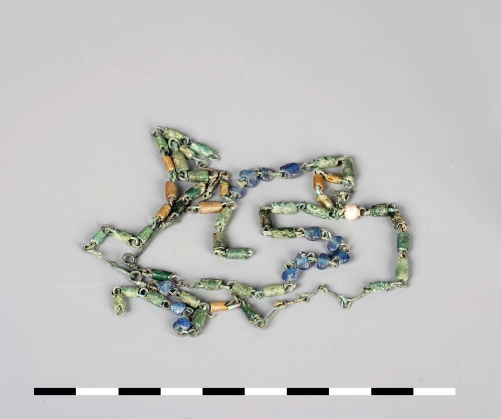 Halsketting van brons met glazen kralen uit de Romei...