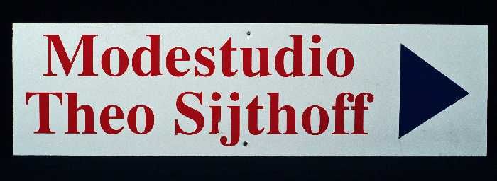 Wit houten bord met in rode letters: "Modestudio The...