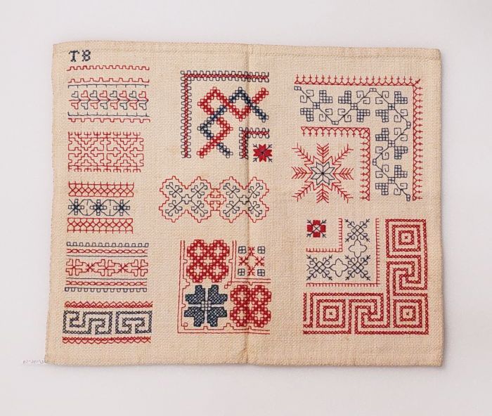 Merklap gewerkt in kruissteek met gekleurd borduurzi...