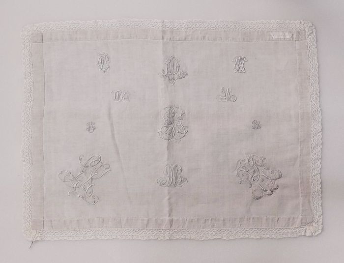 Letterlap gewerkt in wit katoen in platsteek op wit ...