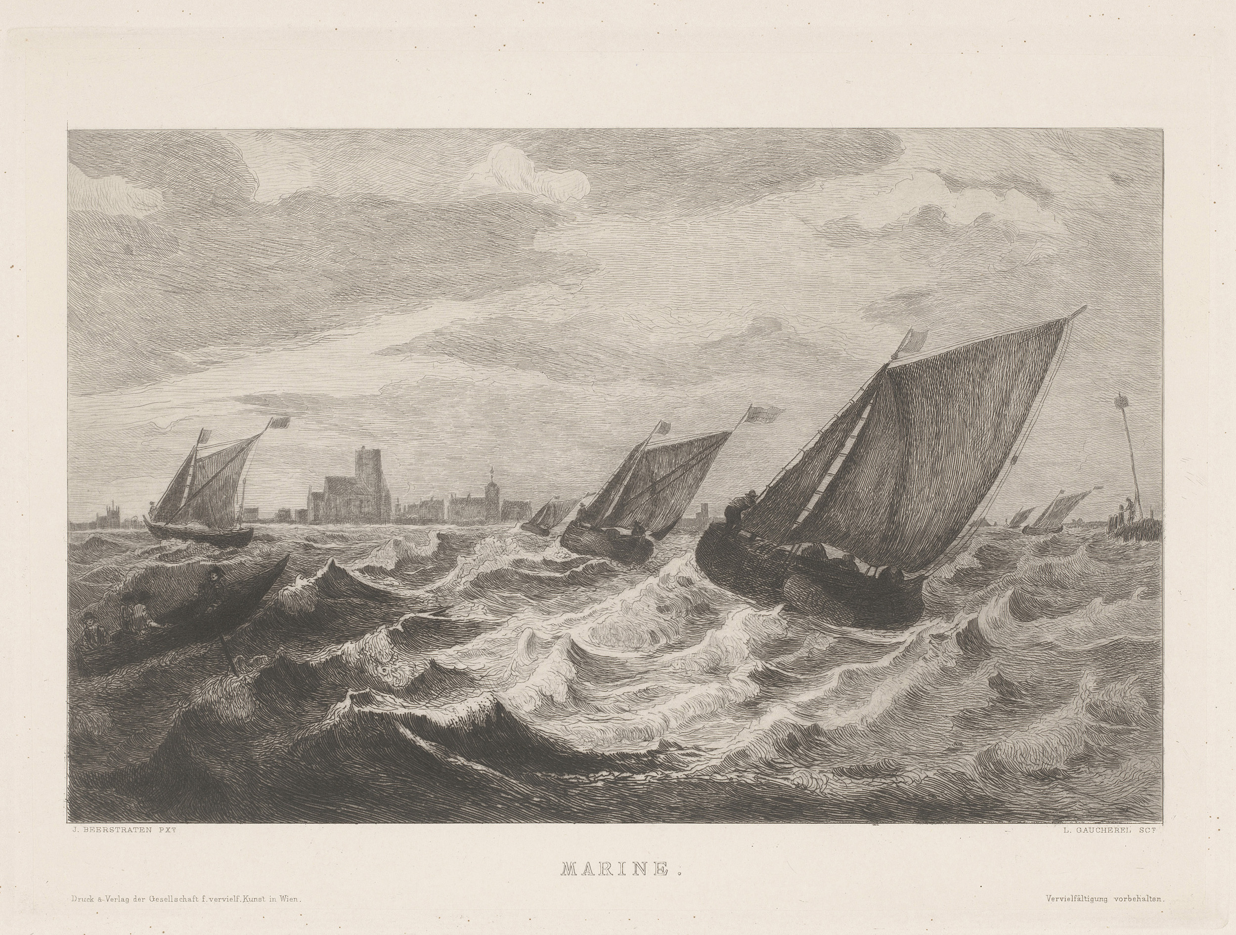 Zeezicht met schepen op woelig water