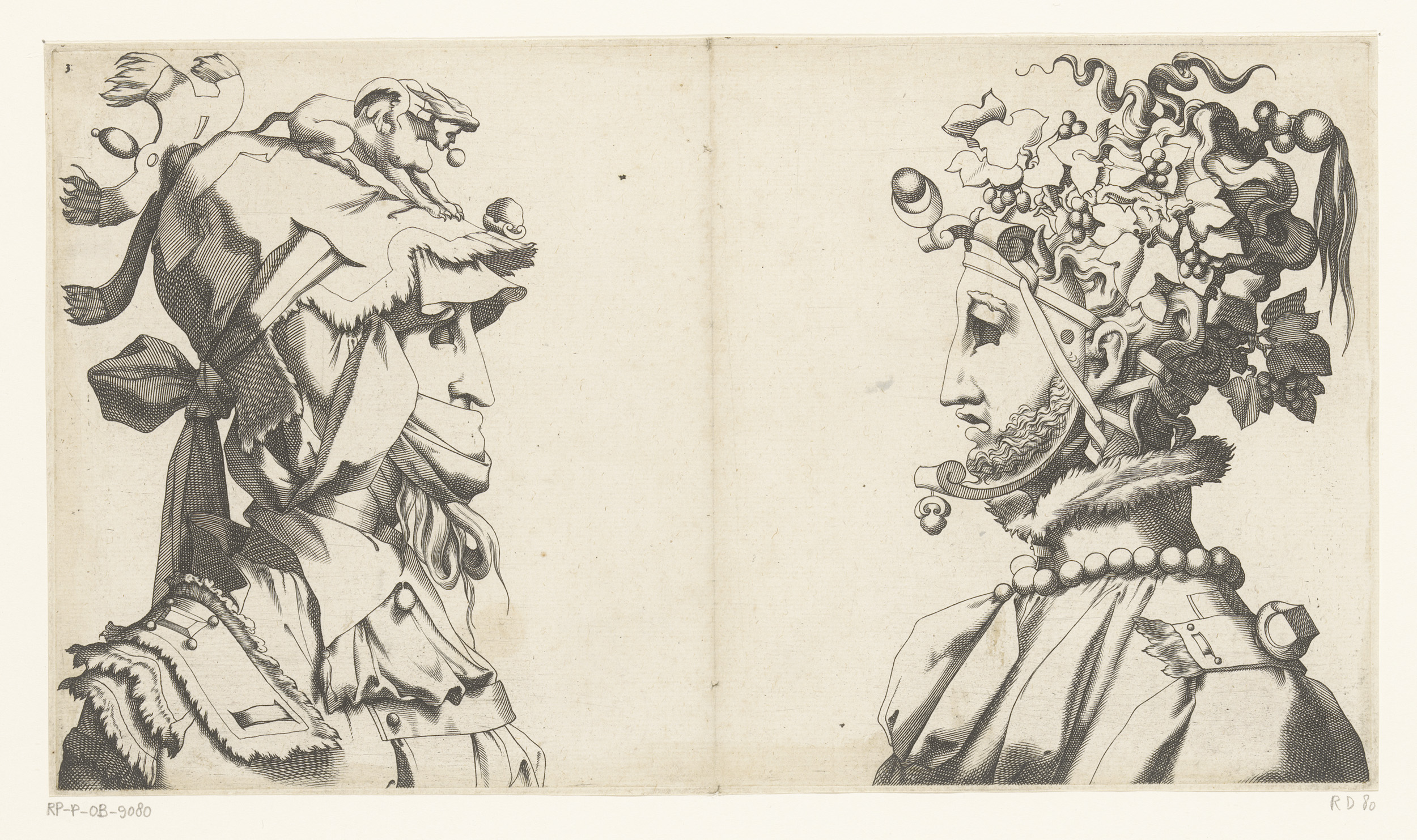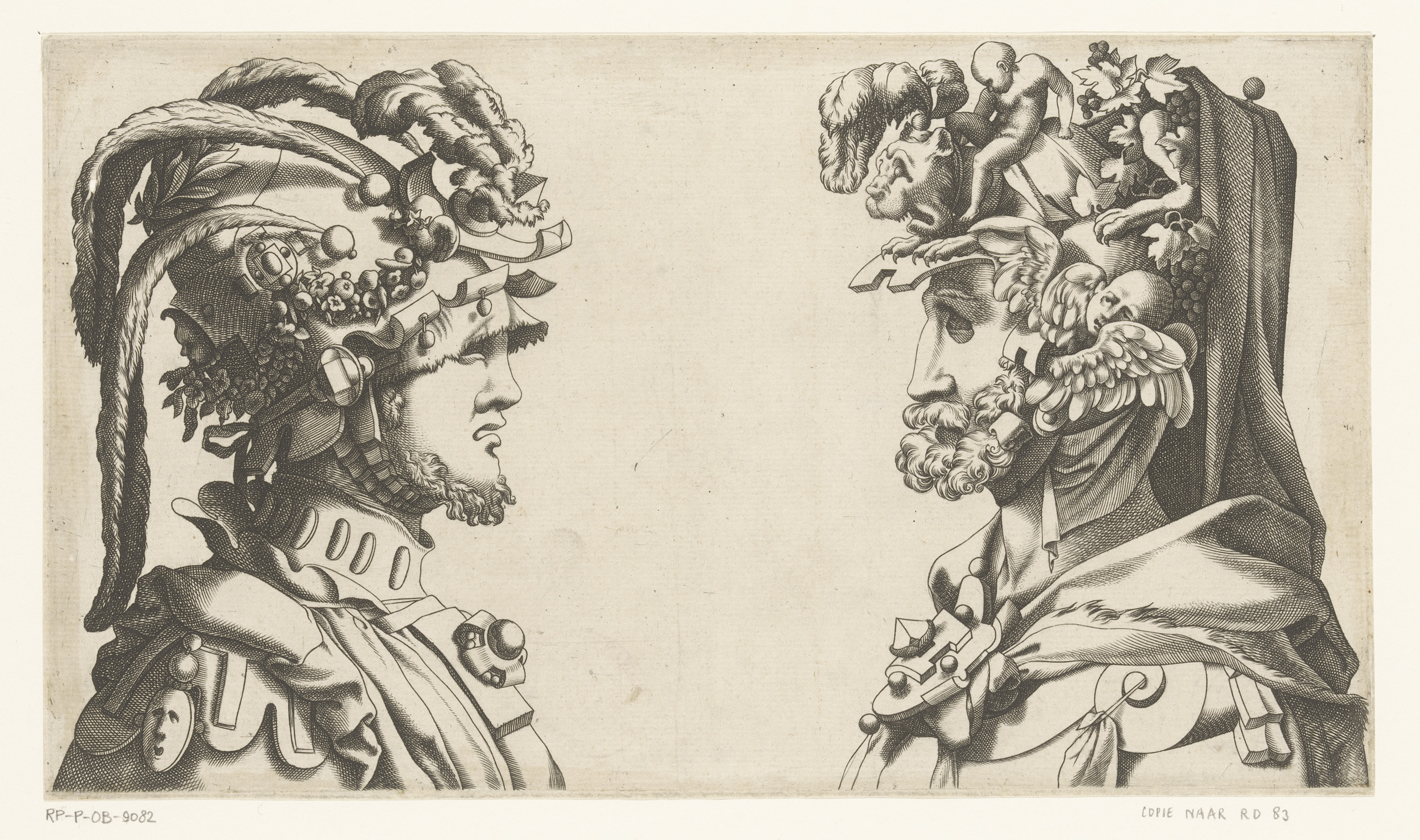 Twee mannenbustes met maskers en fantasiehoofdbedekking