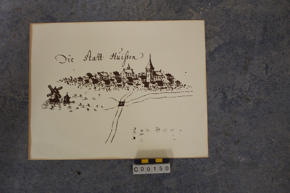 Reproduktie van een gezicht op de stad Huissen in 1712