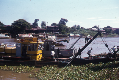Baggermachine aan het werk in een rivier in Azië.