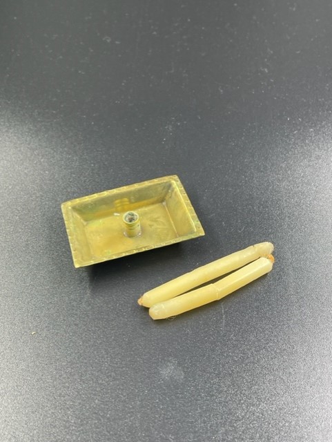 Geel koperen rechthoekige blaker met drie kaarsen