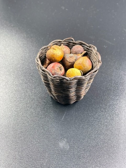 Ovale mand met twee mandflessen, stapel witte doeken...