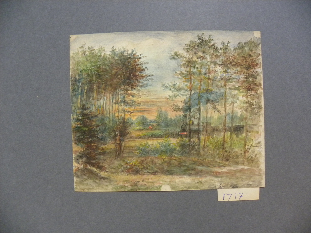 Aquarel voorstellende landschap met man en locomotie...