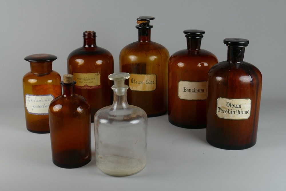 apothekersflessen van verschillende maten en kleuren...