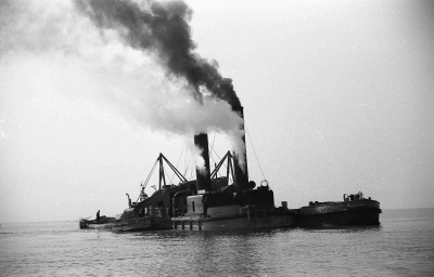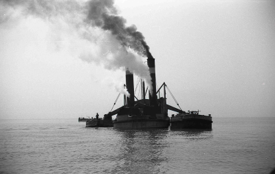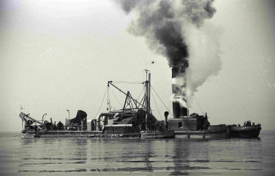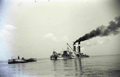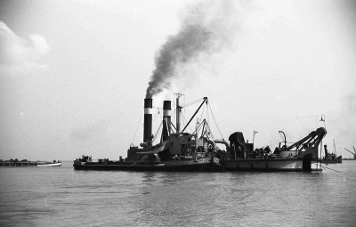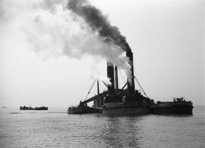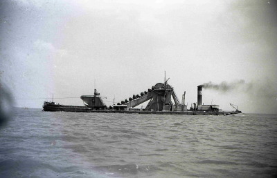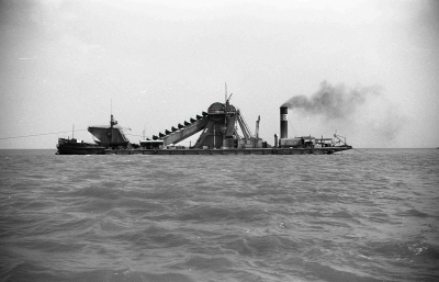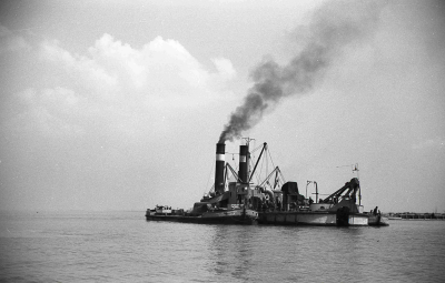 Stoomzandzuiger, bezig met werkzaamheden aan de dijk...