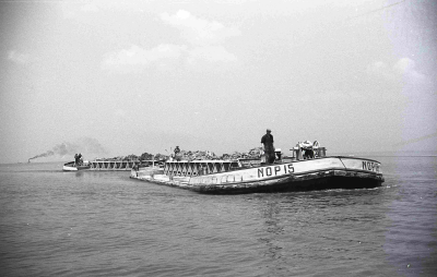 Sleepboot trekt onderlosser voort, gevuld met zand b...