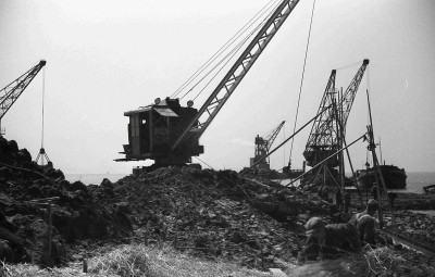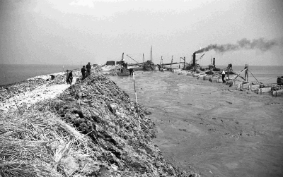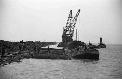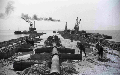 Aanleg van de dijken van de Noordoostpolder.
