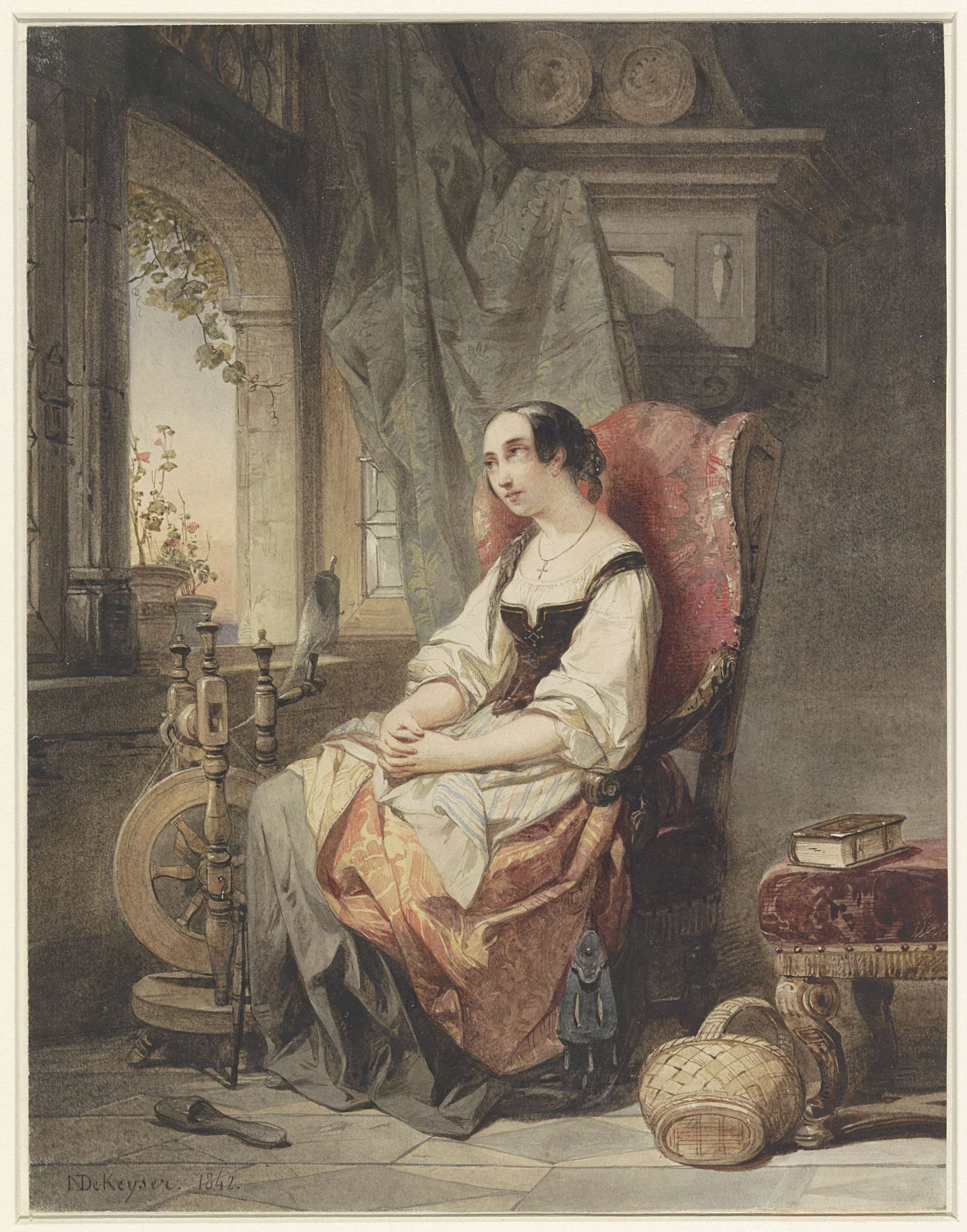 Greteken bij het spinrokken, zittend bij een open raam
