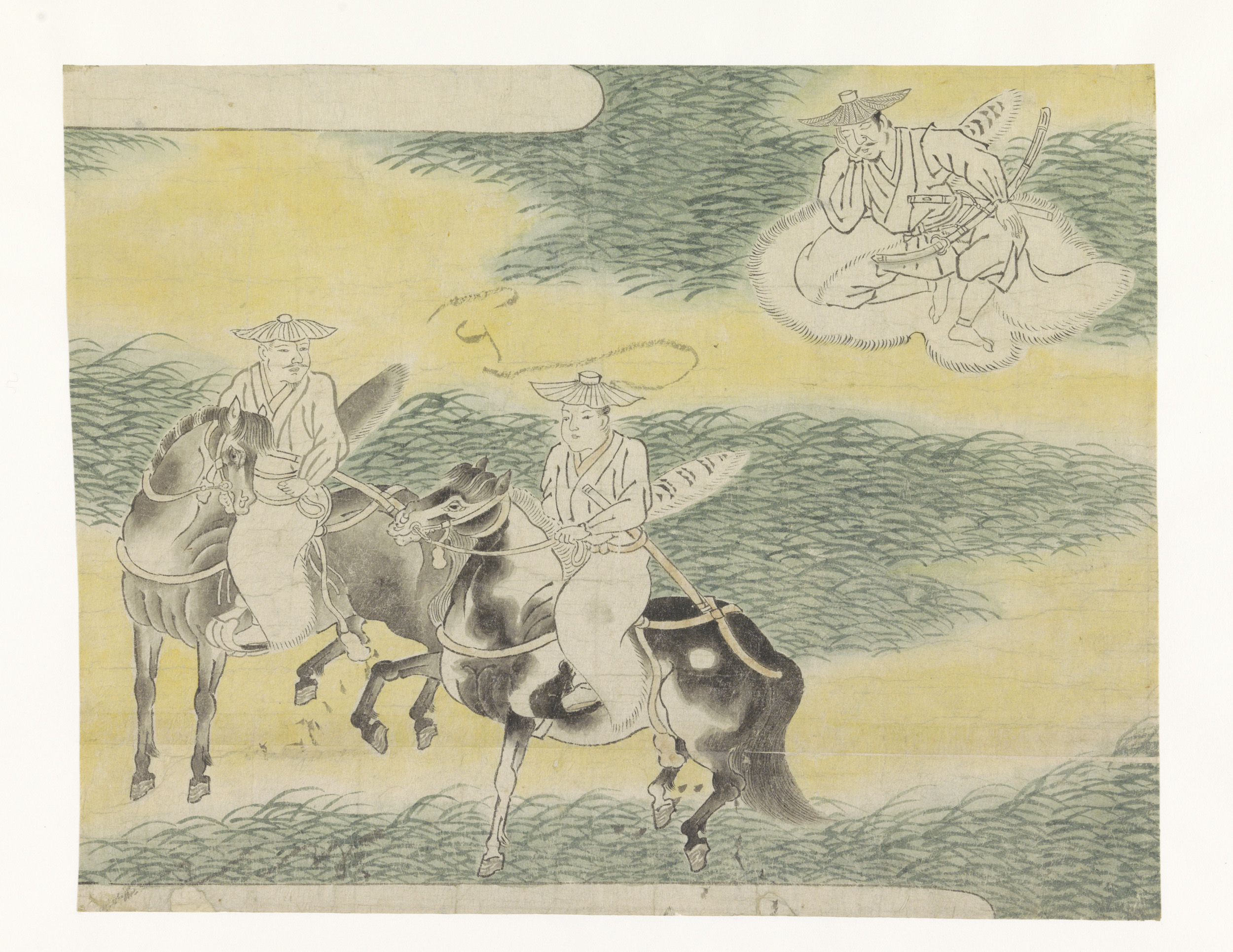 Twee ruiters te paard en rechts een slapende samoerai