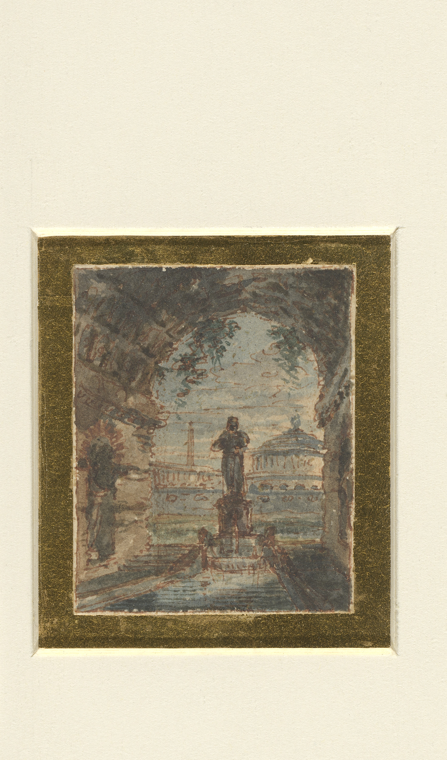 Doorkijk vanuit een rond gewelf op klassieke gebouwen