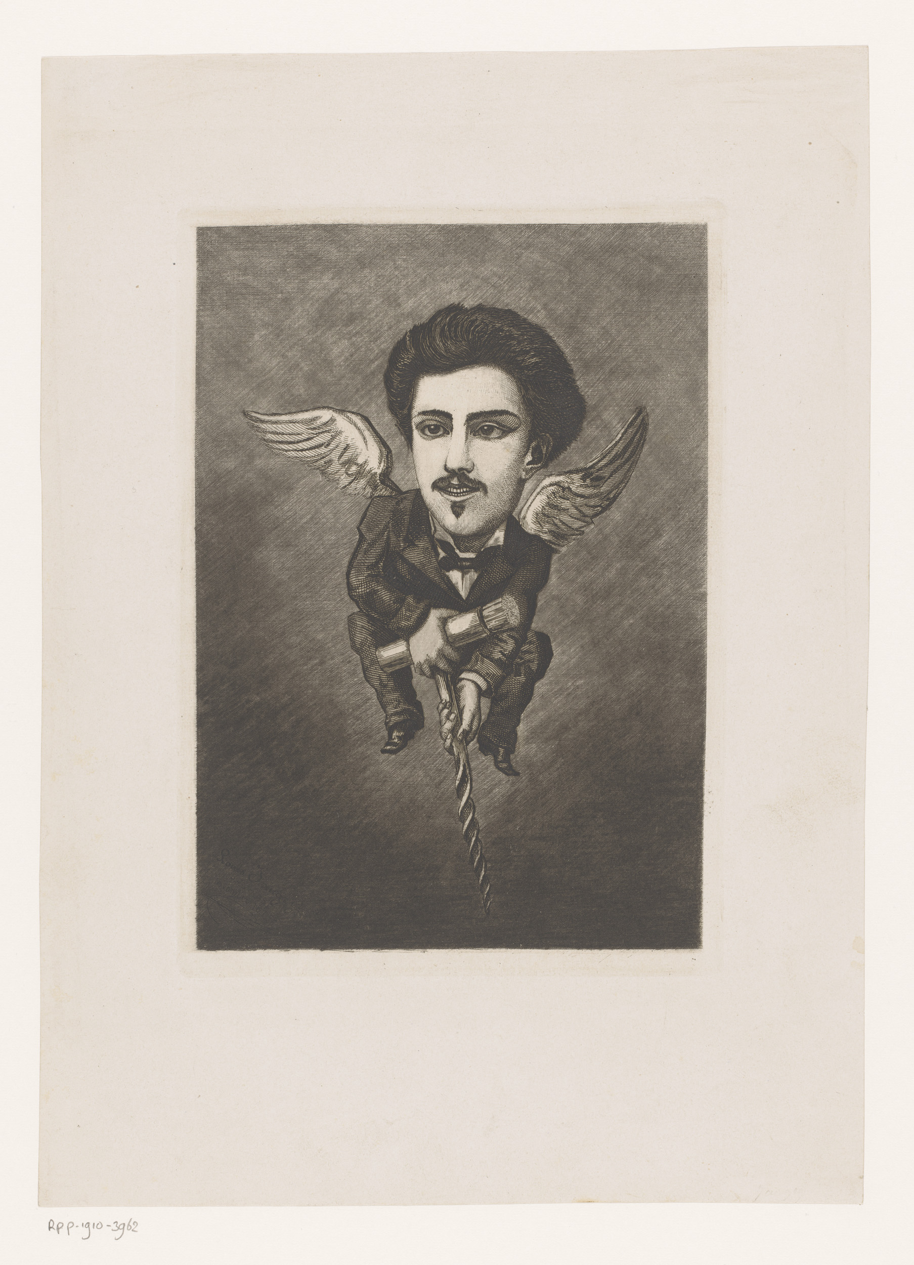 Man met buitenproportioneel groot hoofd, vleugels en...