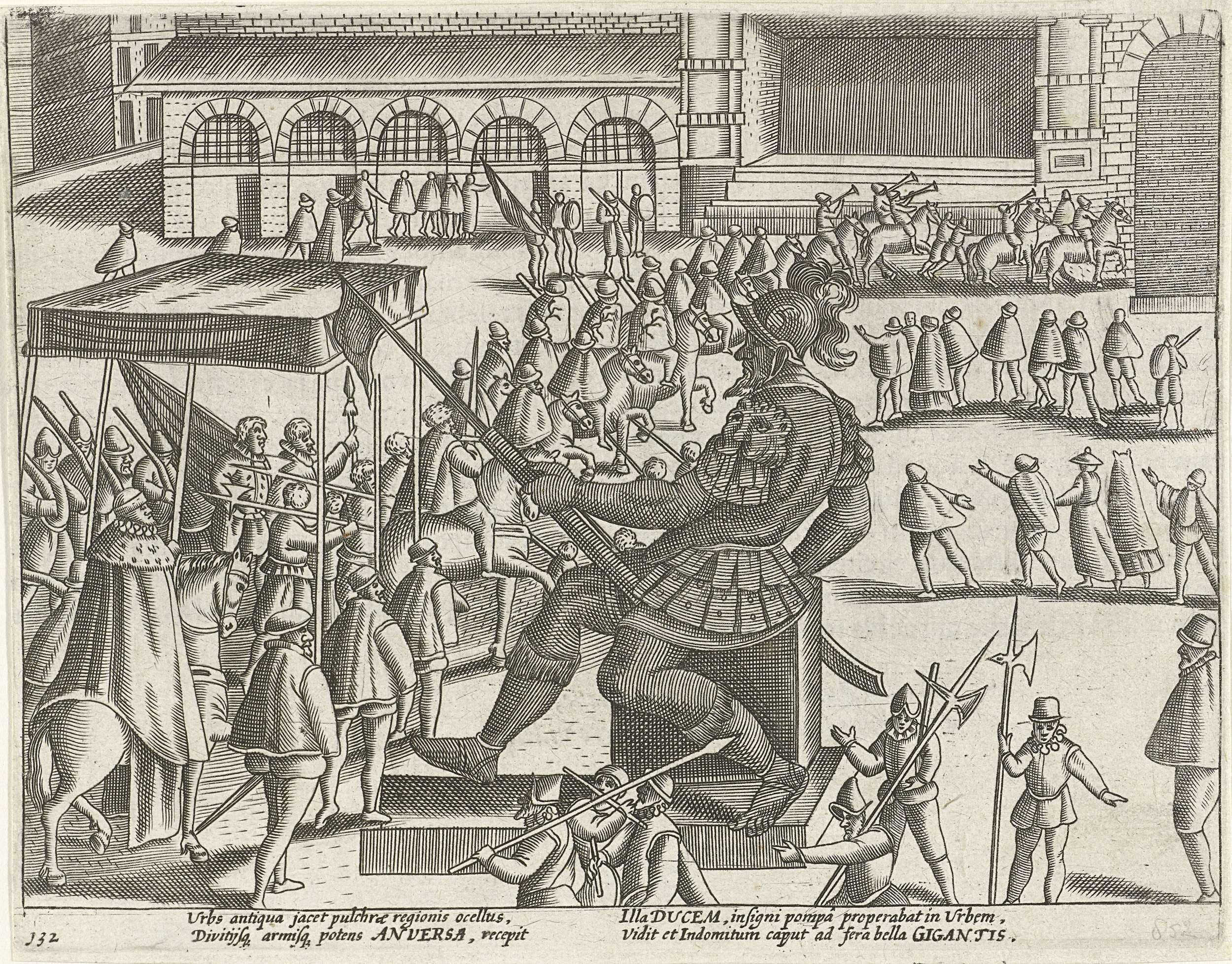 De stoet trekt langs het beeld van de reus Antigoon ...