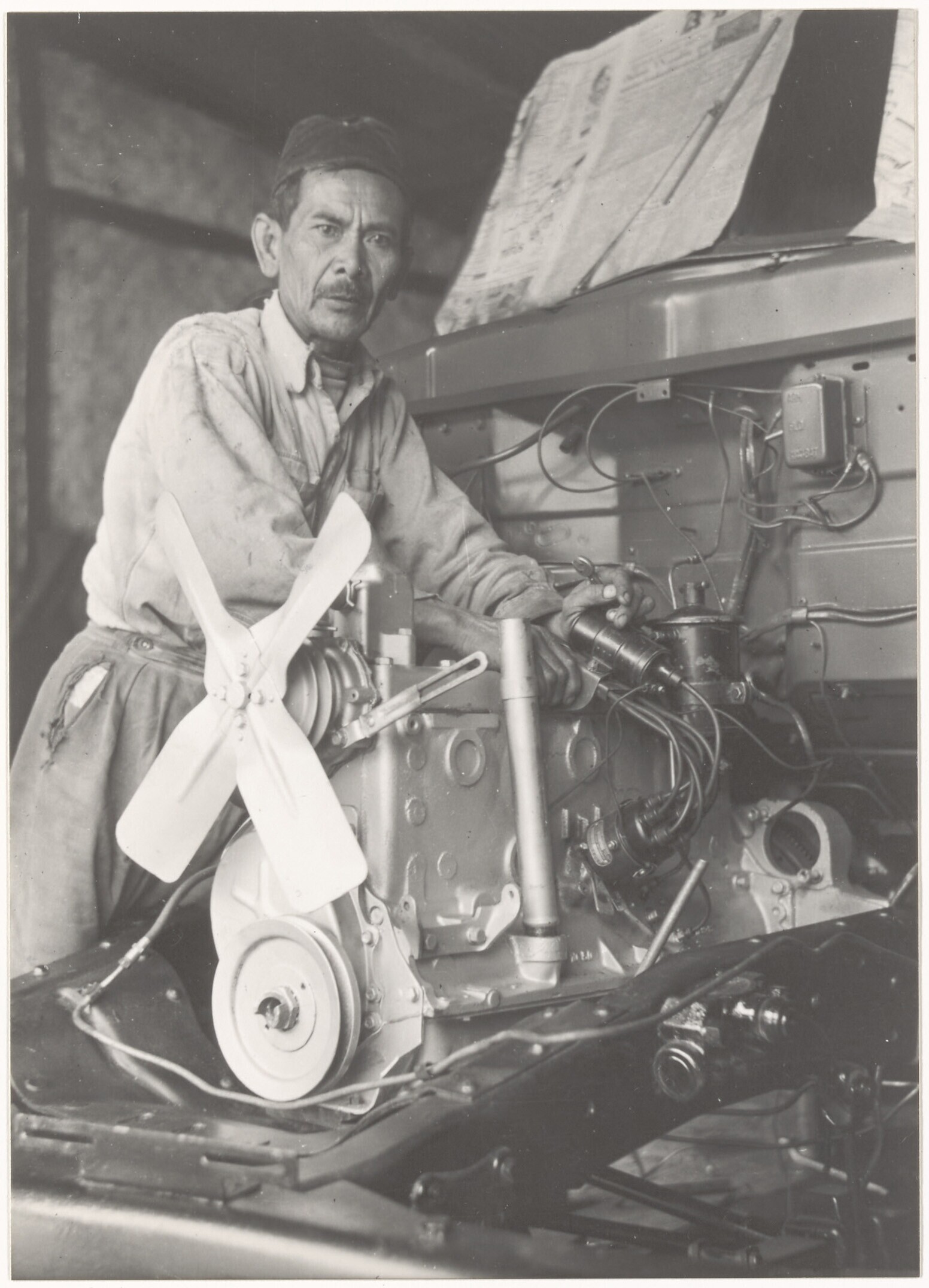 Een man repareert een machine op kina- en theeondern...