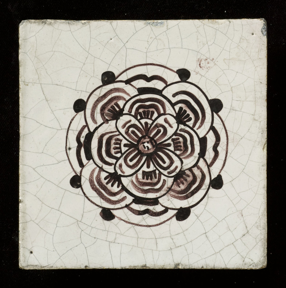 Tegel in tinglazuur, voorstellende het decor 'rozen ...