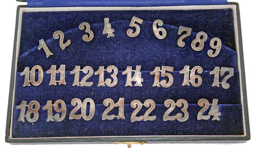 Zilveren glas nummers in zwart etui. Nummers 1 t/m 24