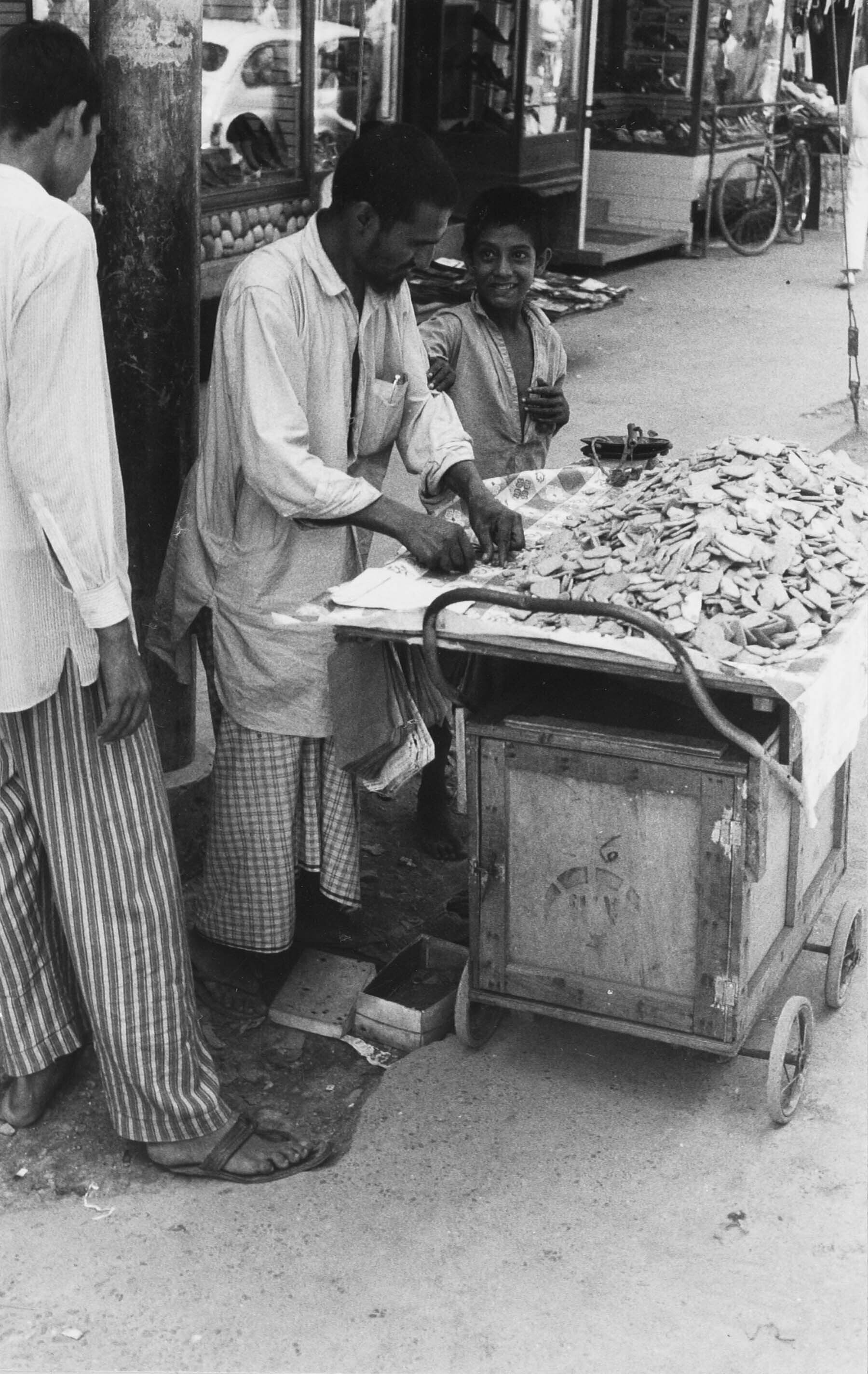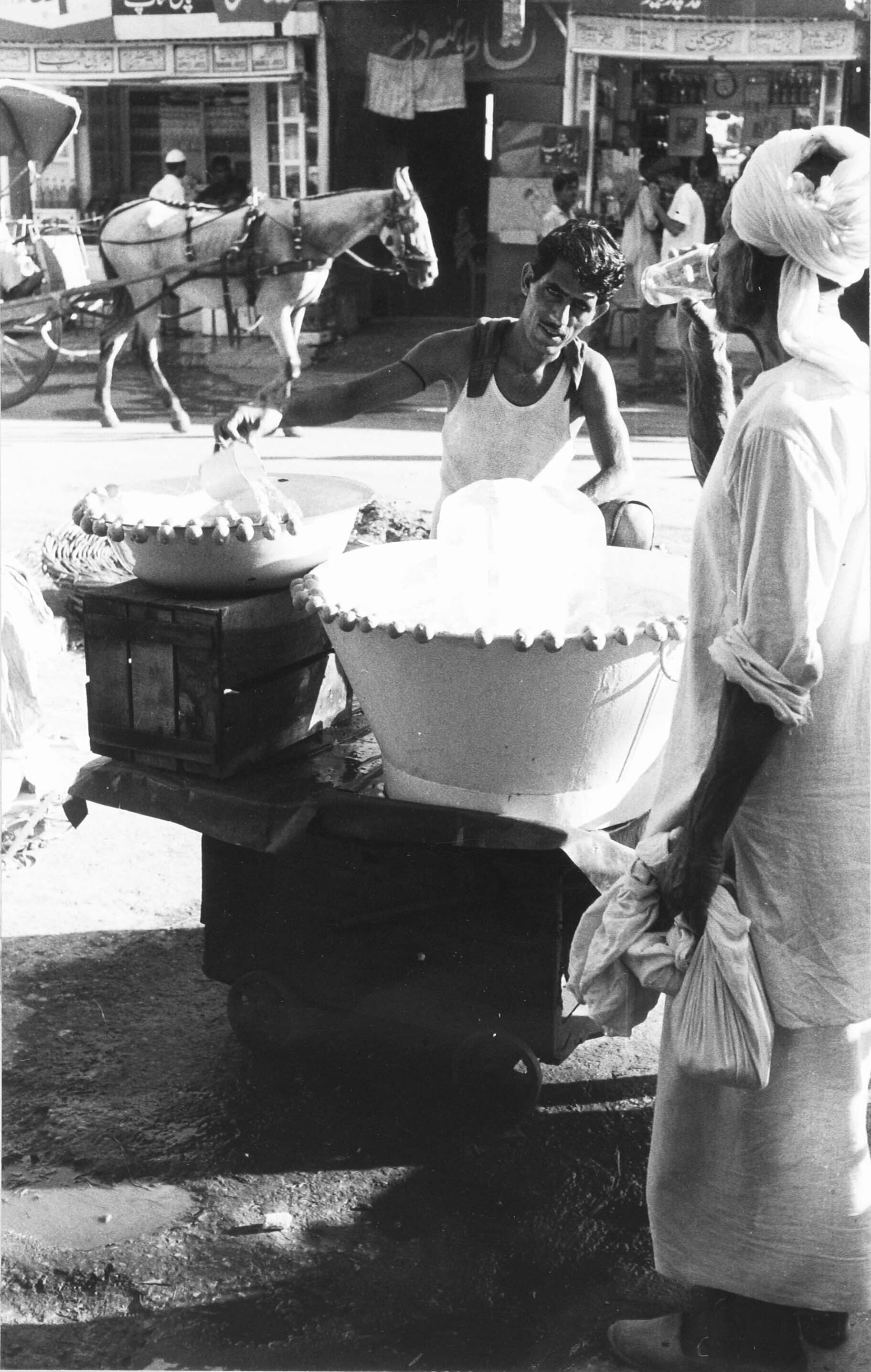 Limonade-verkoper. Op de randen van de teilen zijn c...