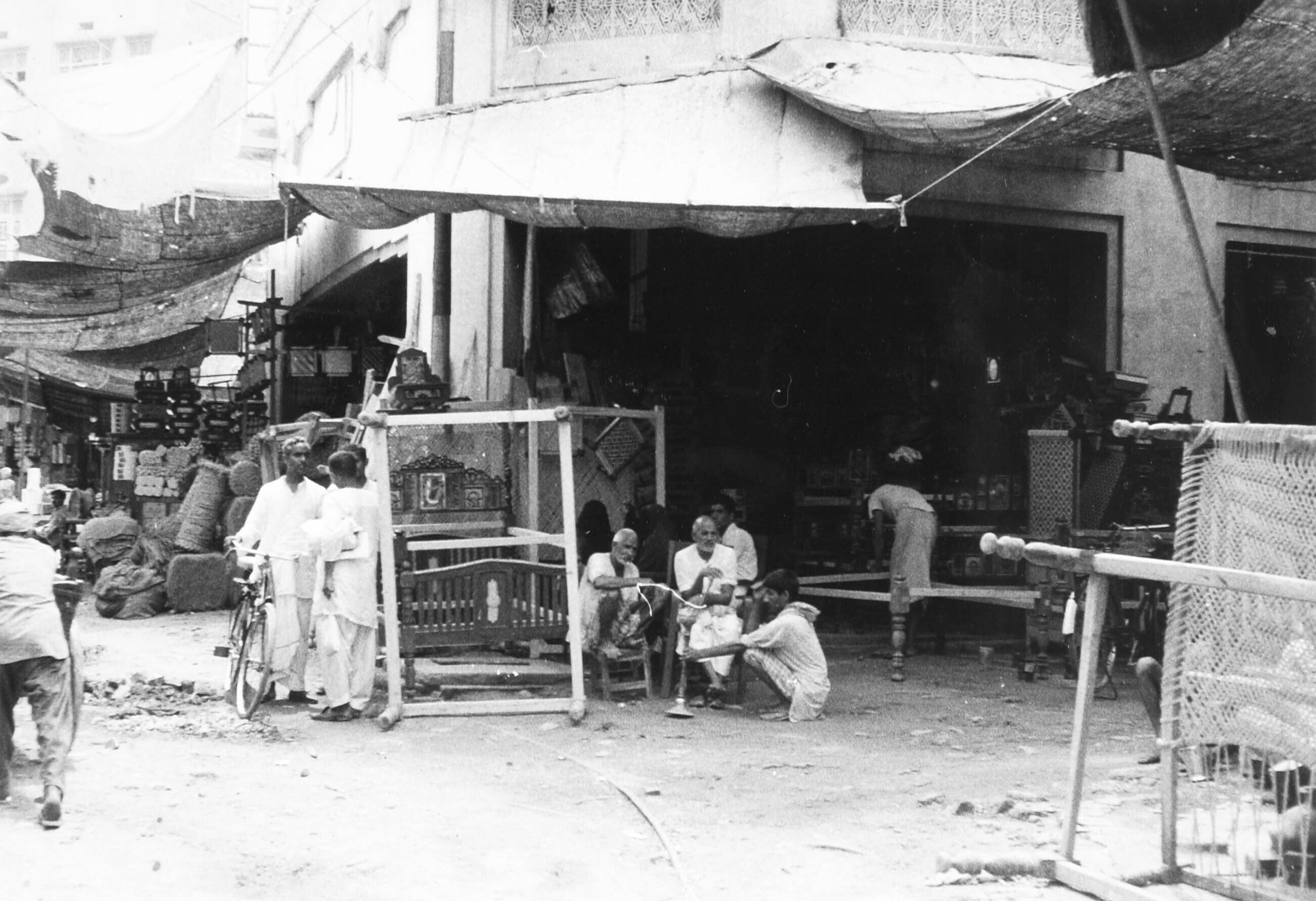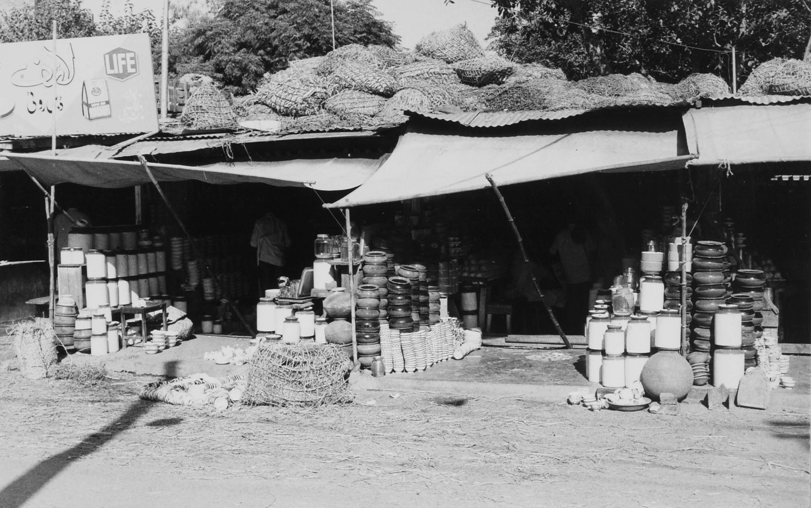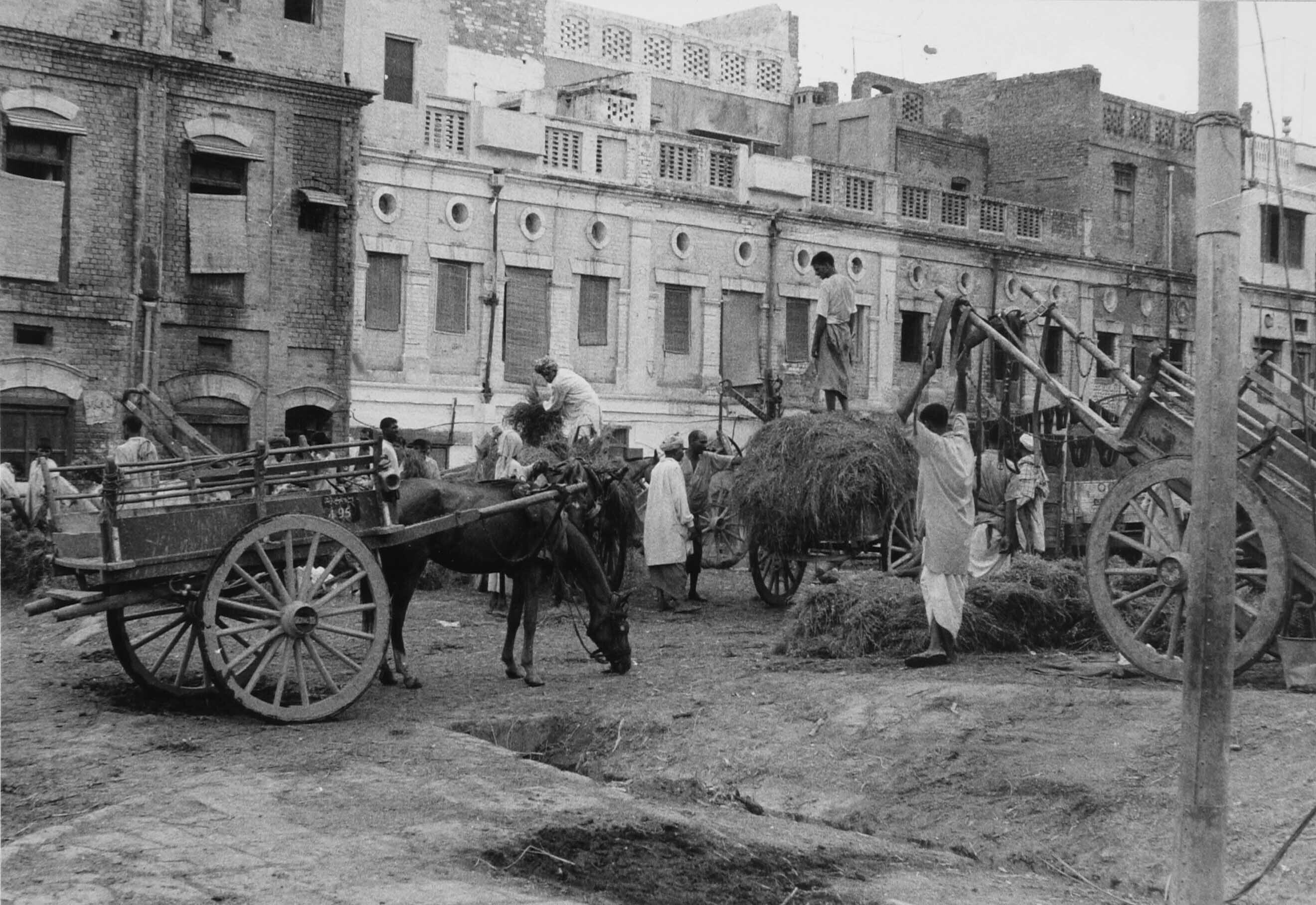 Straatbeeld met op de voorgrond enkel charpays en op...