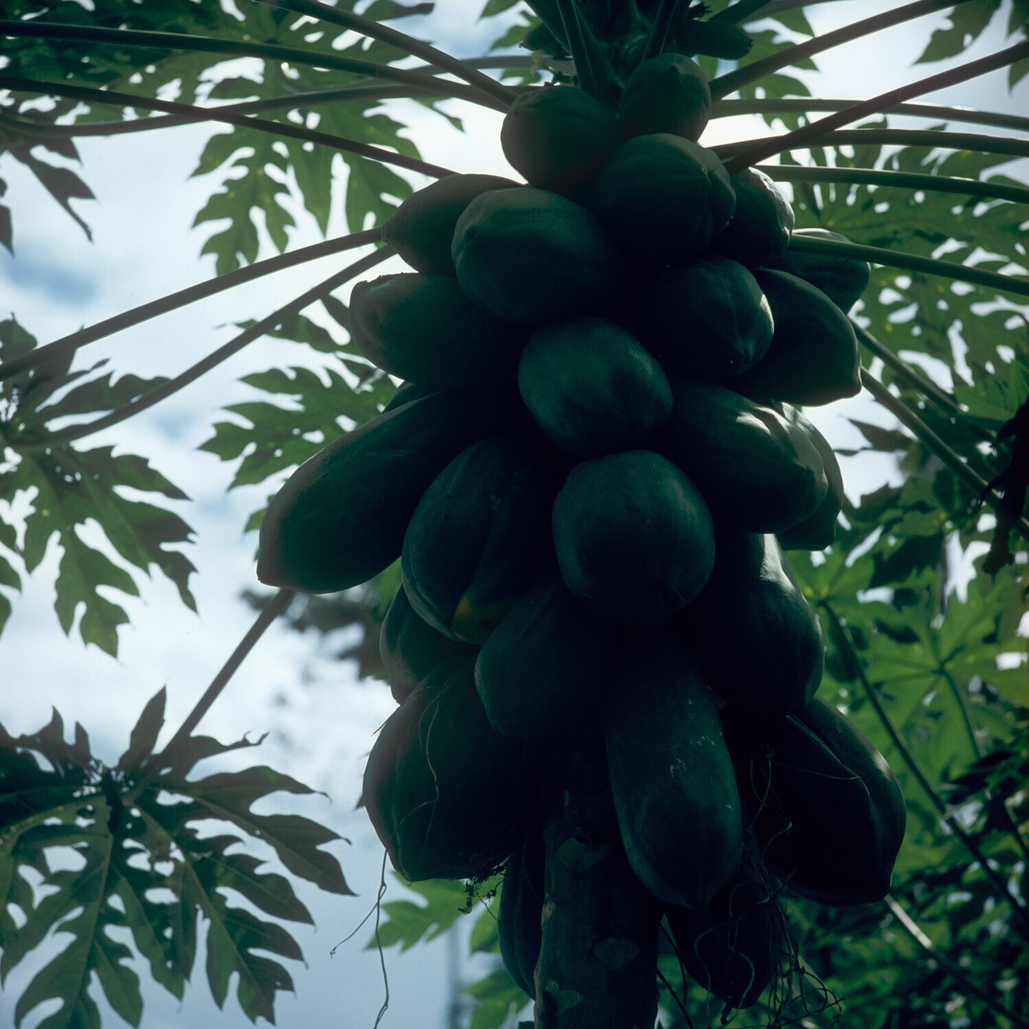 Papajavruchten aan de boom, in de buurt van Palu, Su...