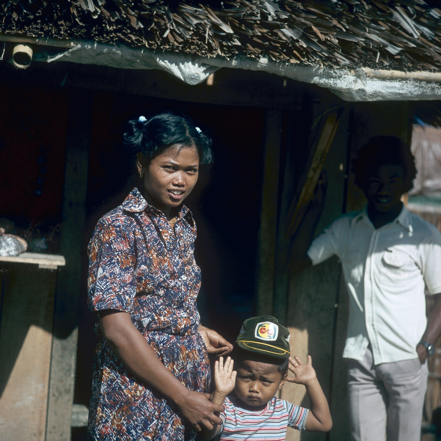 Moeder en kind voor hun huis, in de buurt van Palu, ...