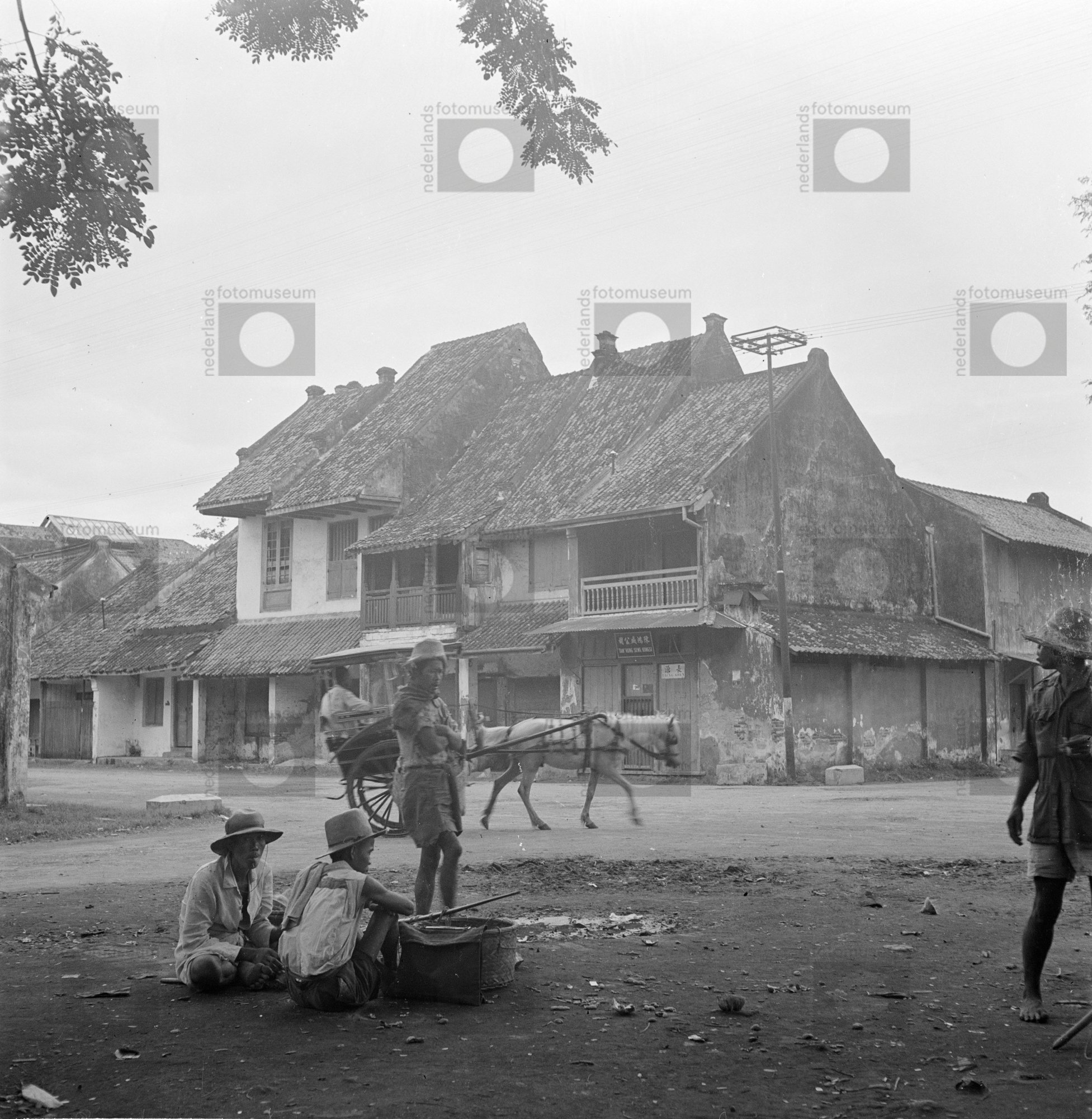 Straatgezicht met koloniale bouwwerken en koets op v...