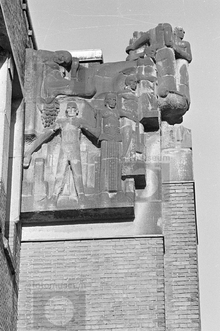 Beeldhouwwerk van Hildo Krop aan de voorgevel van ee...