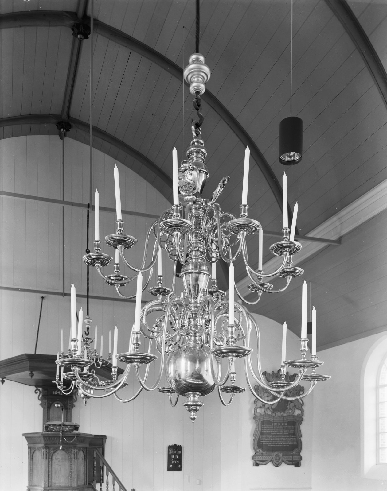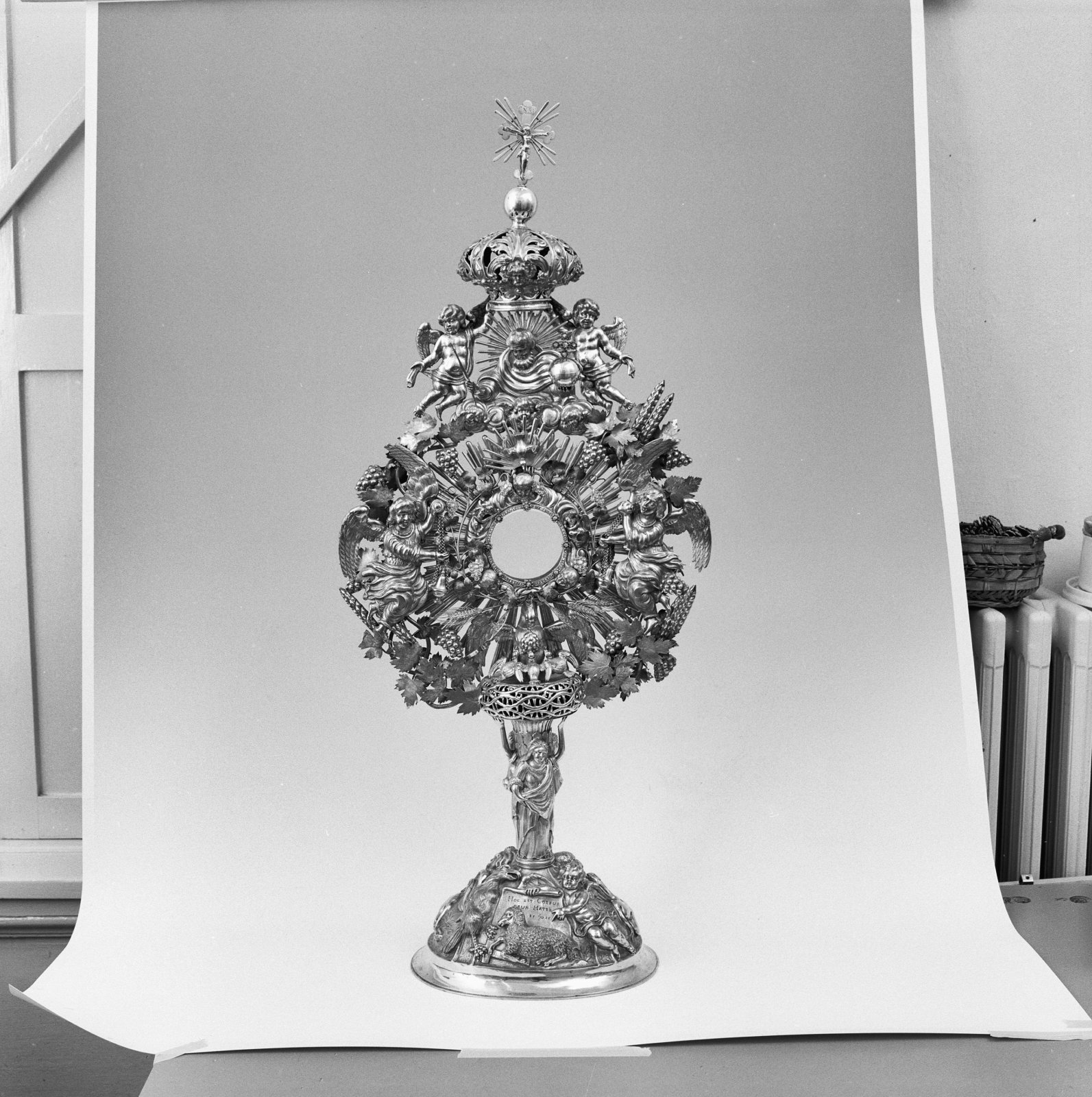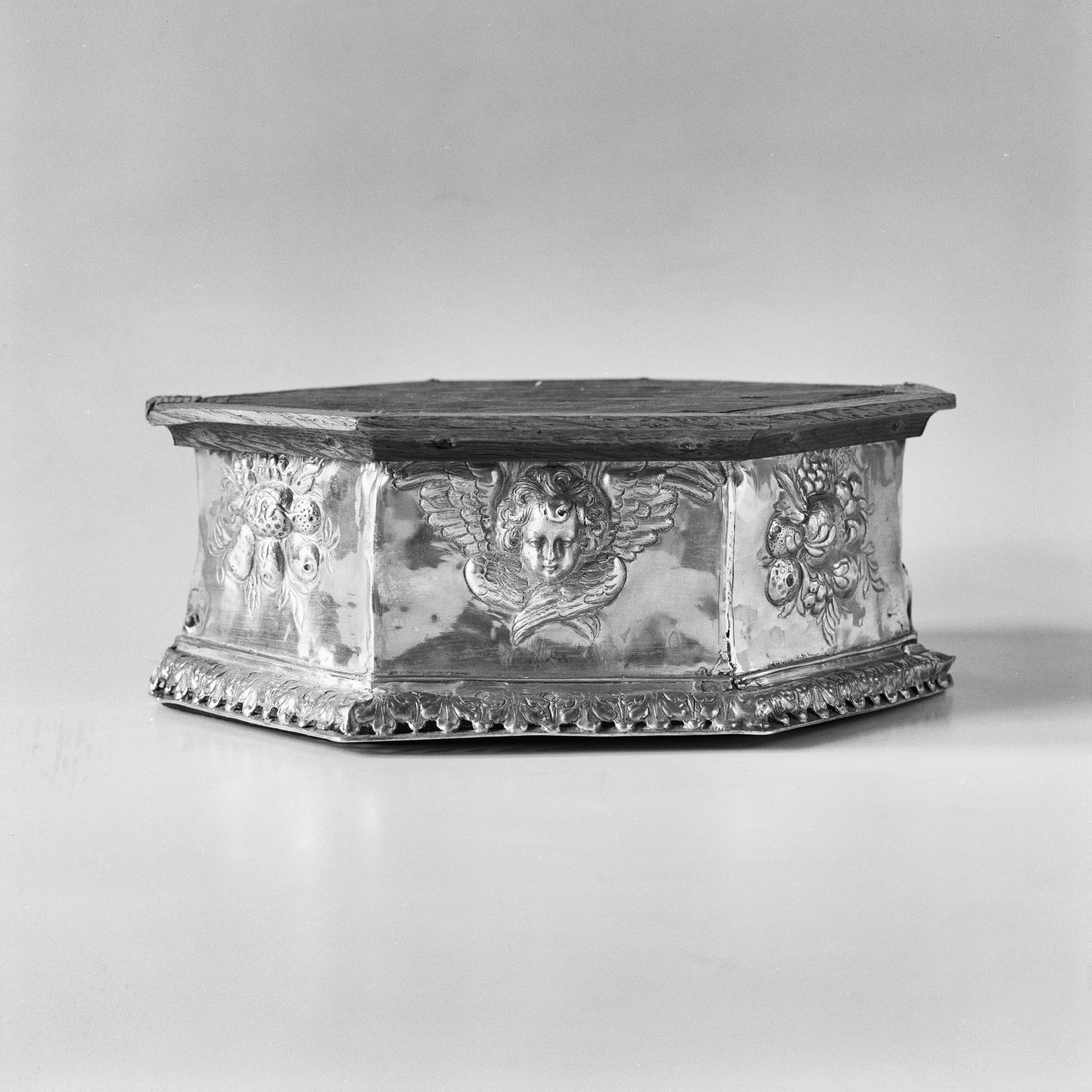 Interieur, houten kerkattribuut met zilver afgewerkt